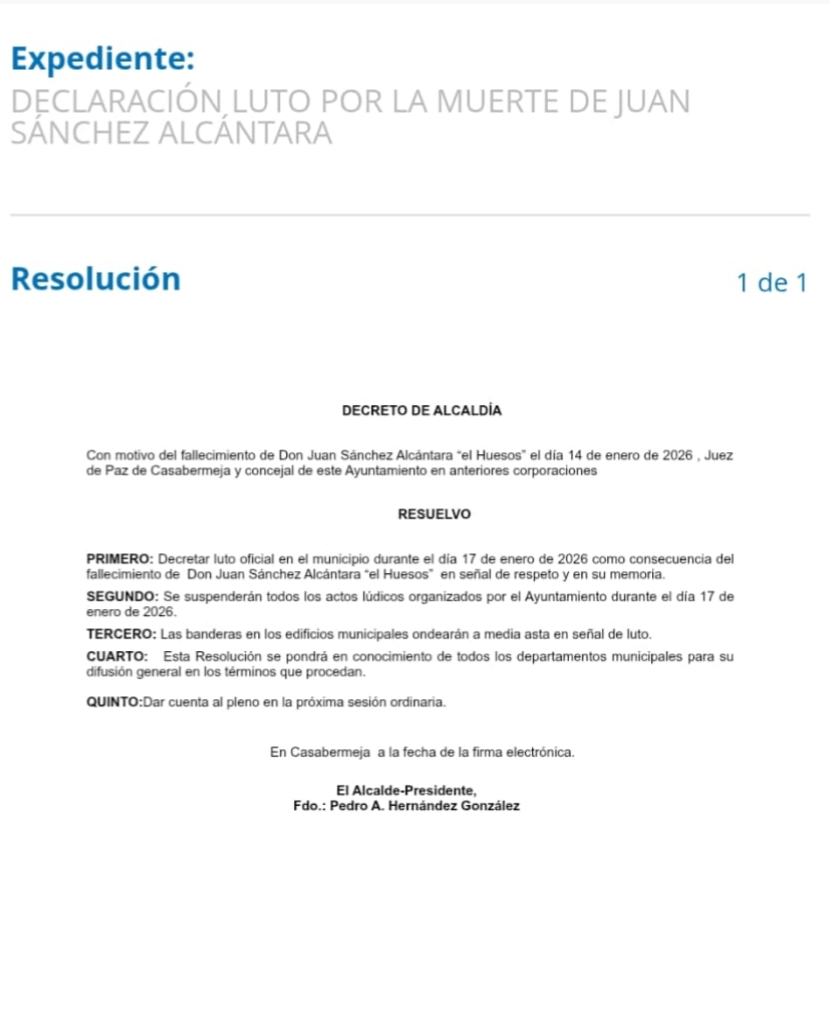 La Corporación Local decreta luto oficial el sábado 17 de enero de 2026 por el fallecimiento de Juan Sánchez Alcántara, quien fuera Juez de Paz y concejal de este Ayuntamiento en anteriores legislaturas.