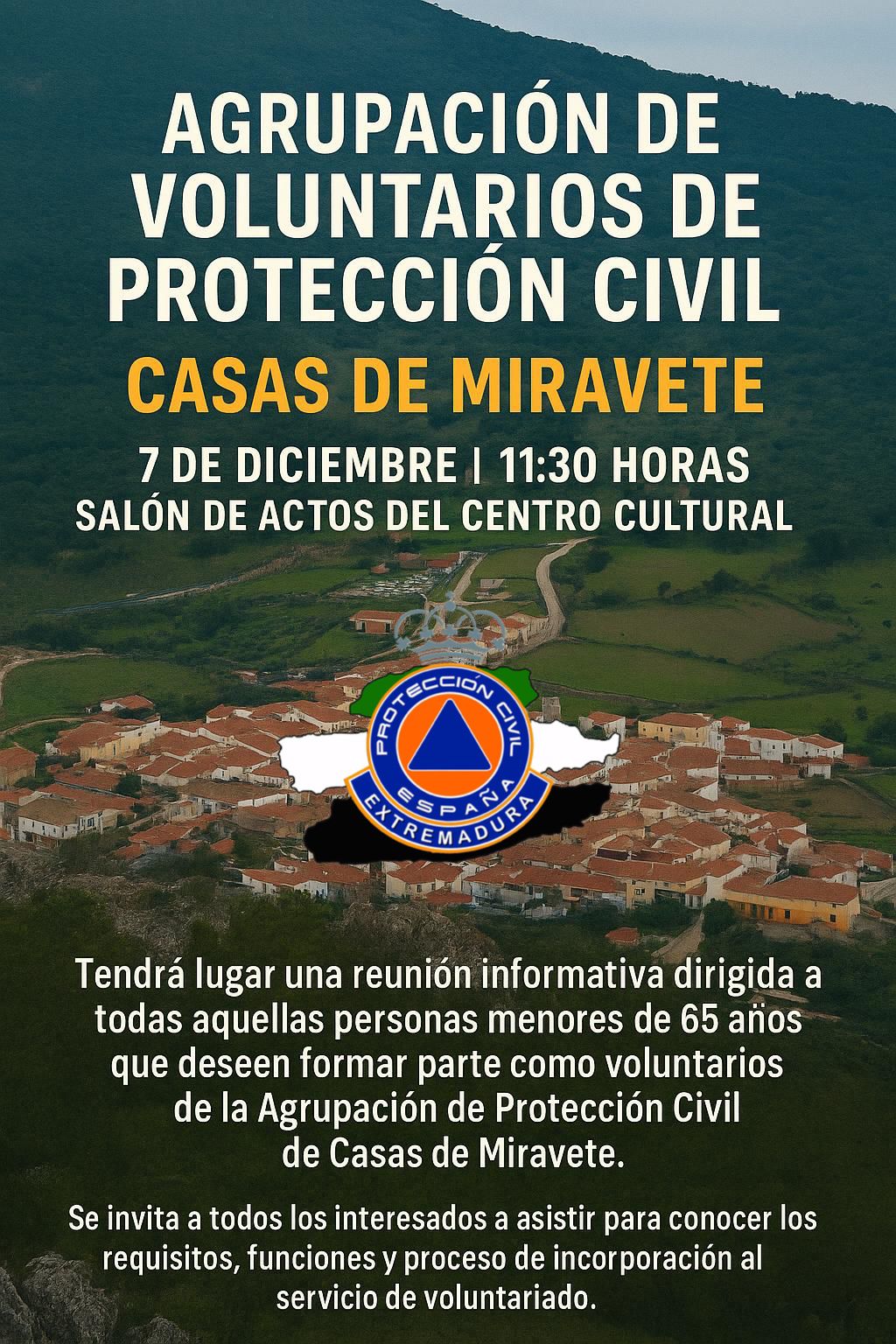 El Ayuntamiento de Casas de Miravete informa a todos los vecinos y vecinas que el próximo domingo 7 de diciembre, a las 11:30 horas, tendrá lugar una reunión informativa sobre la creación de la Agrupación de Voluntarios de Protección Civil de Casas de Miravete.