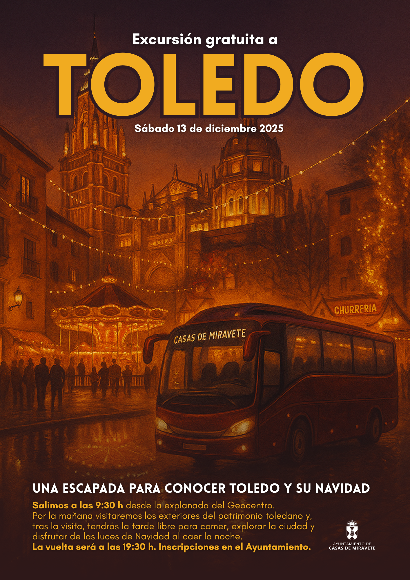 El Ayuntamiento de Casas de Miravete recuerda a todos los vecinos y vecinas que este sábado, 13 de diciembre de 2025, tendrá lugar la excursión gratuita a Toledo, organizada para disfrutar de su patrimonio histórico y del ambiente navideño 🎄.