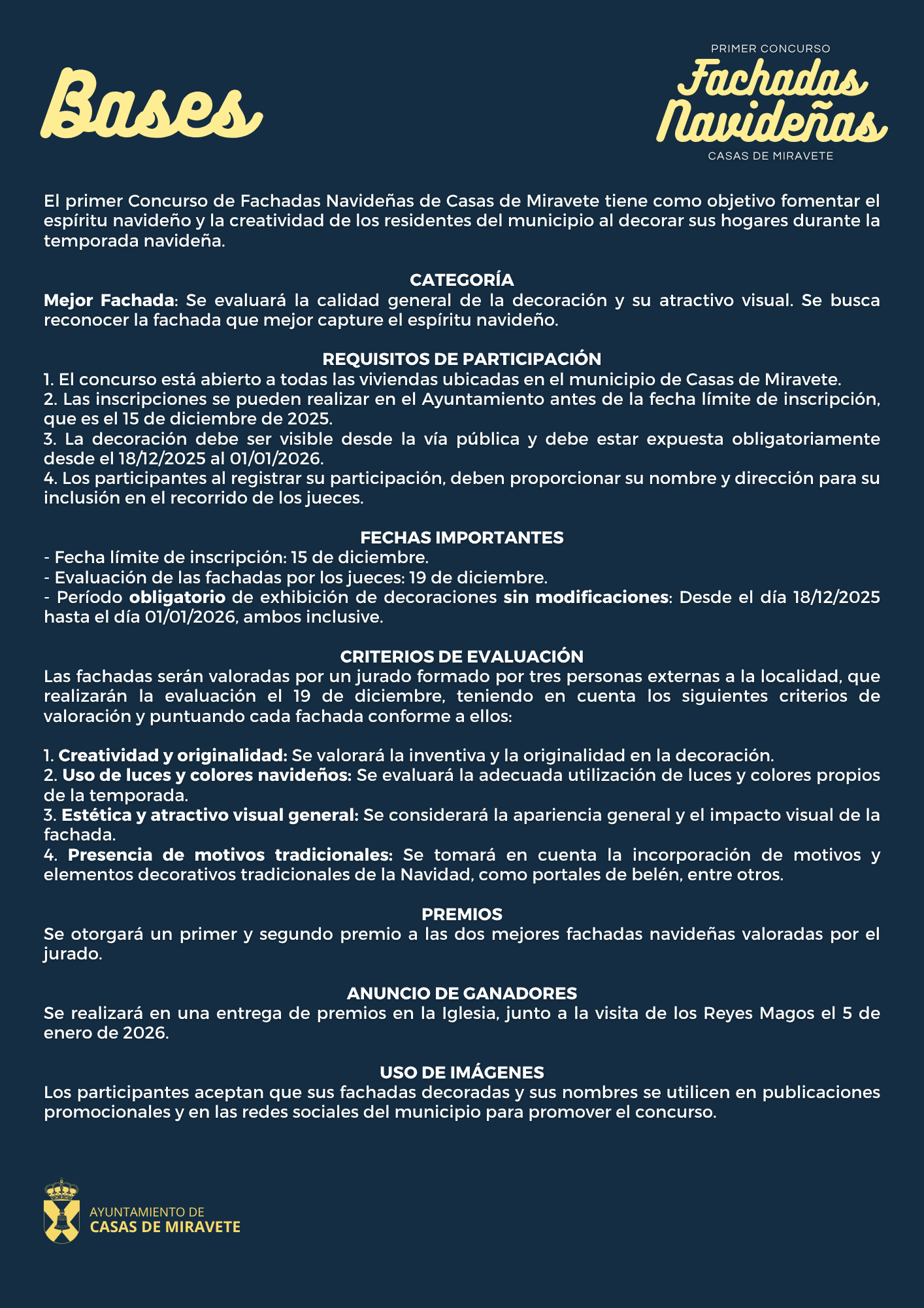 El Ayuntamiento de Casas de Miravete invita a todos los vecinos y vecinas a participar en el Primer Concurso de Fachadas Navideñas, una iniciativa destinada a fomentar el espíritu navideño y la creatividad en nuestro municipio.
