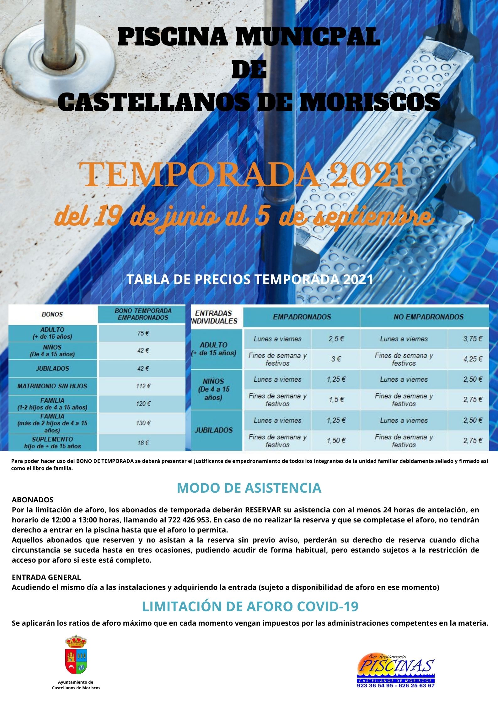 El próximo sábado 19 de junio, da comienzo la temporada de baño en las Piscinas Municipales de Castellanos de Moriscos, que se extenderá hasta el domingo 5 de septiembre. En el cartel anunciador se pueden consultar las tablas de precios, el modo de asistencia y las condiciones de acceso según aforo.