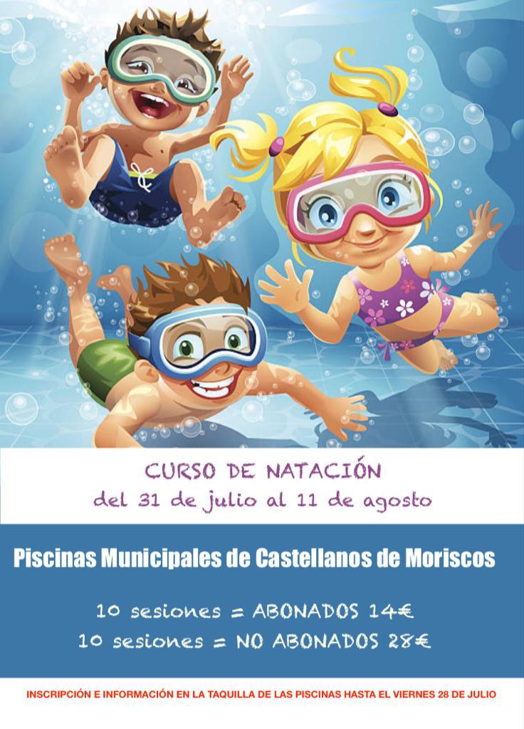 CURSOS DE NATACIÓN PISCINAS DE CASTELLANOS DE MORISCOS2023-07-26 15:02:51DeporteLas Piscinas Municipales de Castellanos de Moriscos, lanzan sus cursos de natación para el periodo de 31 de julio al 11 de agosto. en bonos de 10 sesiones. Toda la información e inscripciones en las taquillas de las piscinas, hasta el 28 de julio.