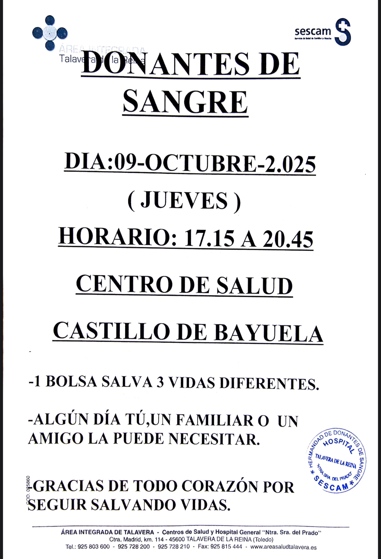 El Ayuntamiento de Castillo de Bayuela informa que hoy, jueves 9 de octubre, de 17:15 a 20:45 horas, se llevará a cabo una colecta de donación de sangre en el Centro de Salud.