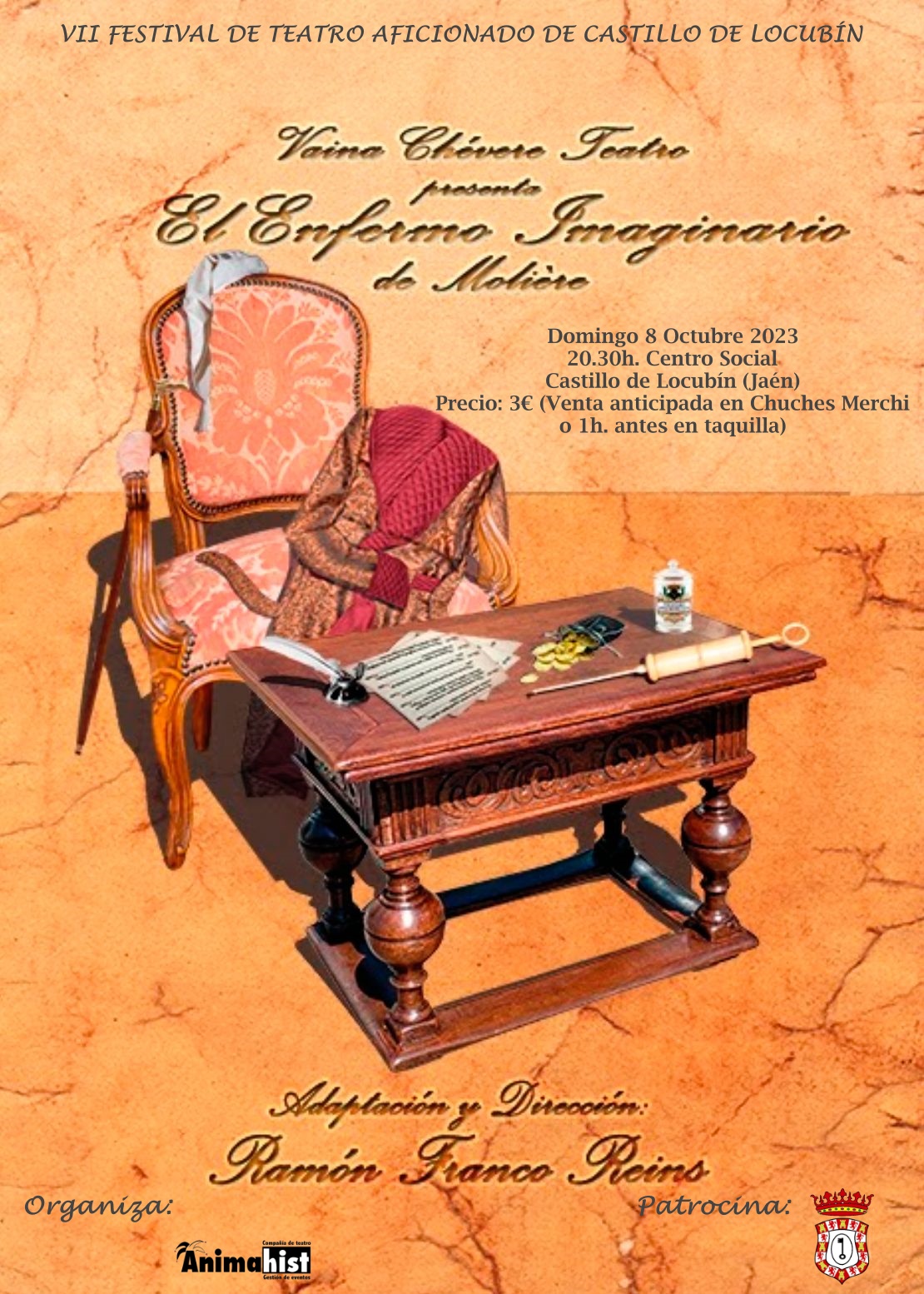 Una obra adaptada y dirigida por Ramón Franco Reins en la que Argán se cree muy enfermo y no puede vivir sin estar rodeado de médicos. Para conseguir tener uno en su familia que le haga ahorrar la ingente cantidad de dinero que destina a sus curas, medicamentos y potingues, no duda en concretar un matrimonio de convivencia entre su hija Angélica con el hijo de la doctora Diafoirus. El tema de la muerte, aunque omnipresente, es tratado de forma más cómica que impresionante.