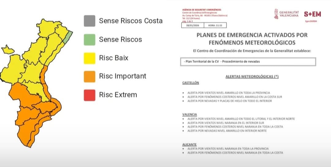 (11:15 h) El Centro de Coordinación de Emergencias emite boletín de fenómenos meteorológicos y establece las siguientes alertas: