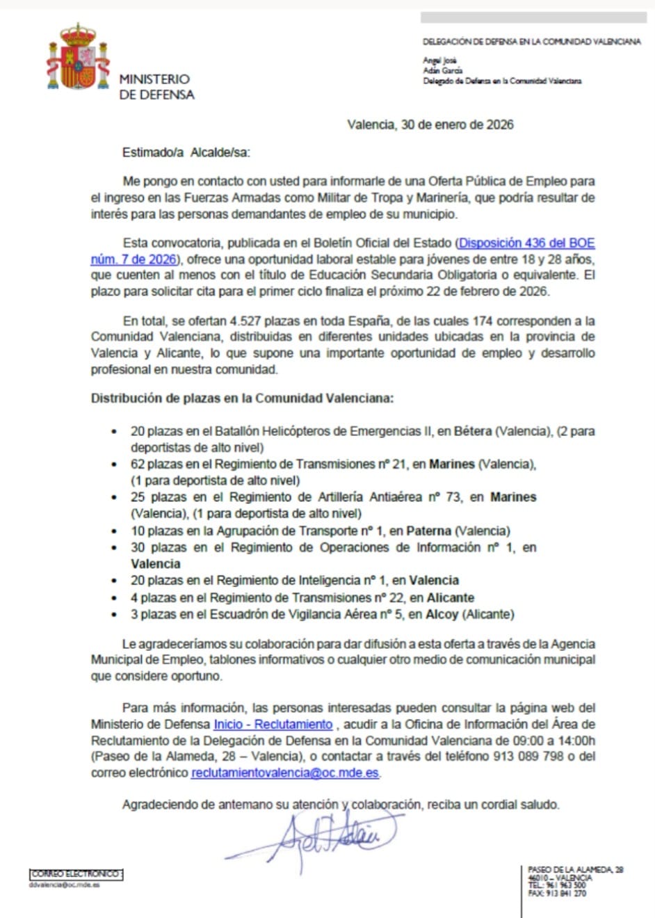 Desde el Ayuntamiento se informa de que se ha recibido comunicación oficial del Delegado de Defensa en la Comunidad Valenciana, Coronel D. Ángel José Adán García,relativa a la Oferta Pública de Empleo y a la convocatoria publicada en el Boletín Oficial del Estado para el ingreso en las Fuerzas Armadas como Militar de Tropa y Marineria.