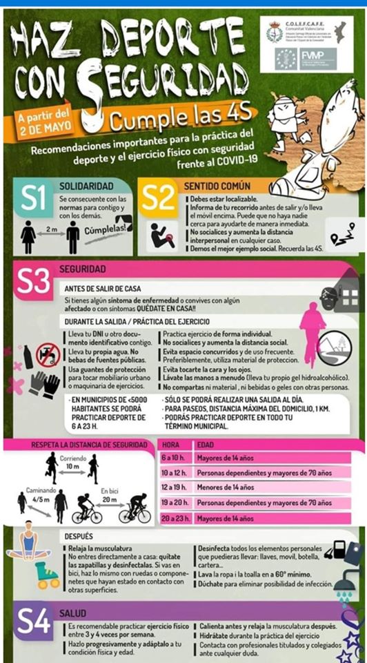 Nuestro municipio cuenta con menos de 5.000 habitantes por lo que la franja horaria para poder practicar deporte y realizar ejercicio físico al aire libre será de 6h a 23h.