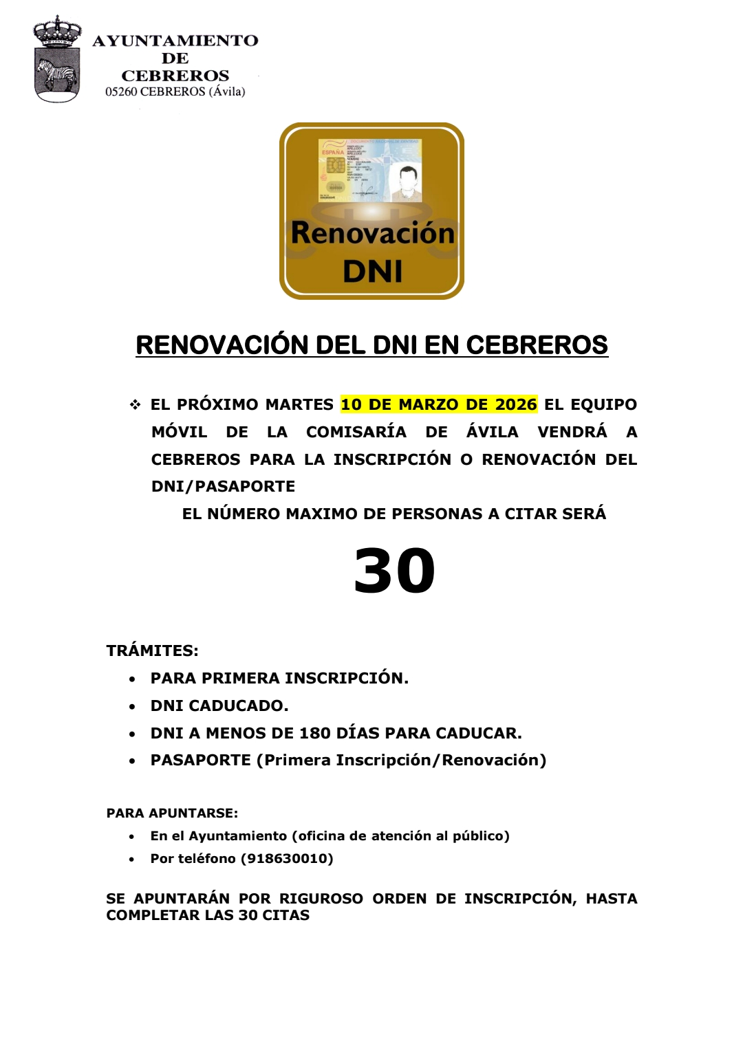 El d铆a 10 de marzo el equipo m贸vil de la Comisar铆a de 脕vila vendr谩 a Cebreros para la inscripci贸n o renovaci贸n del DNI y el pasaporte.
