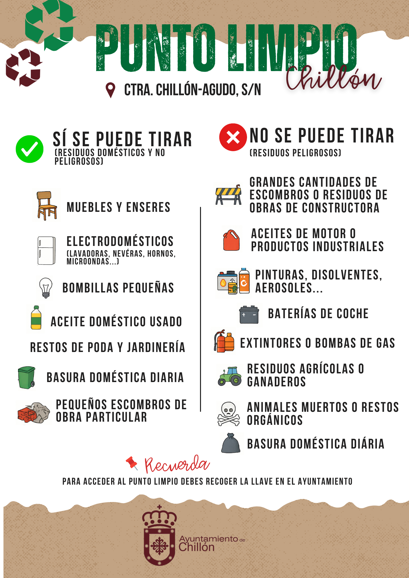 Tras el cierre del vertedero municipal de escombros por parte de los Agentes Medioambientales de la Junta de Comunidades de Castilla-La Mancha, el Ayuntamiento de Chillón ha reorganizado el sistema de gestión de residuos y el uso del Punto Limpio municipal de la forma siguiente: