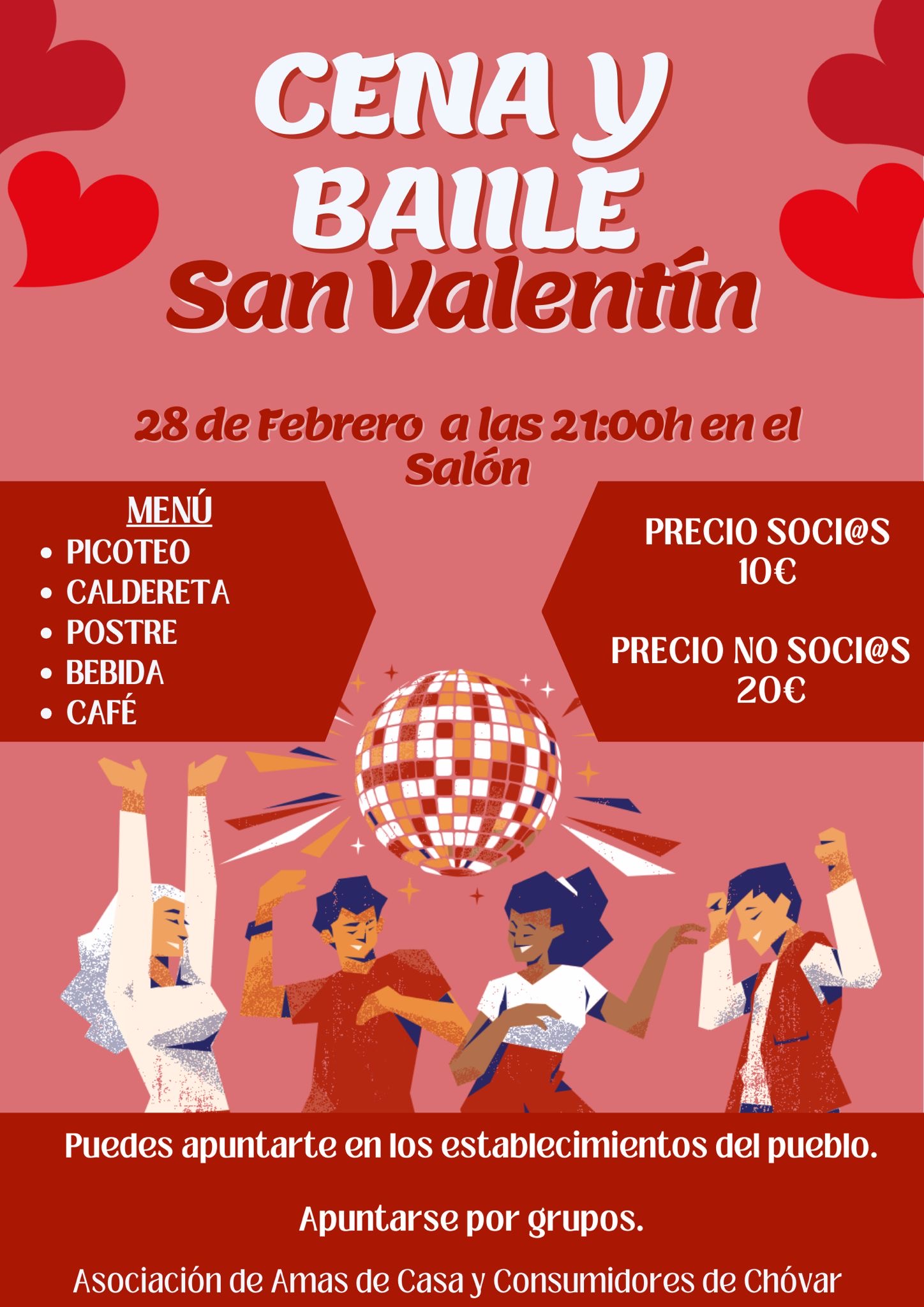La Asociación de Amas de Casa recuerda que la cena de San Valentín es hoy a las 21:00h en el Salón de la Cooperativa.