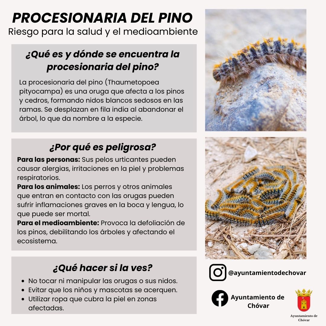 Se informa que debido a la presencia de la oruga procesionaria del pino, es fundamental extremar las precauciones en áreas forestales y parques.