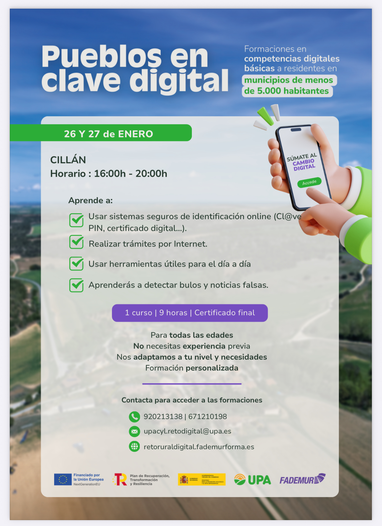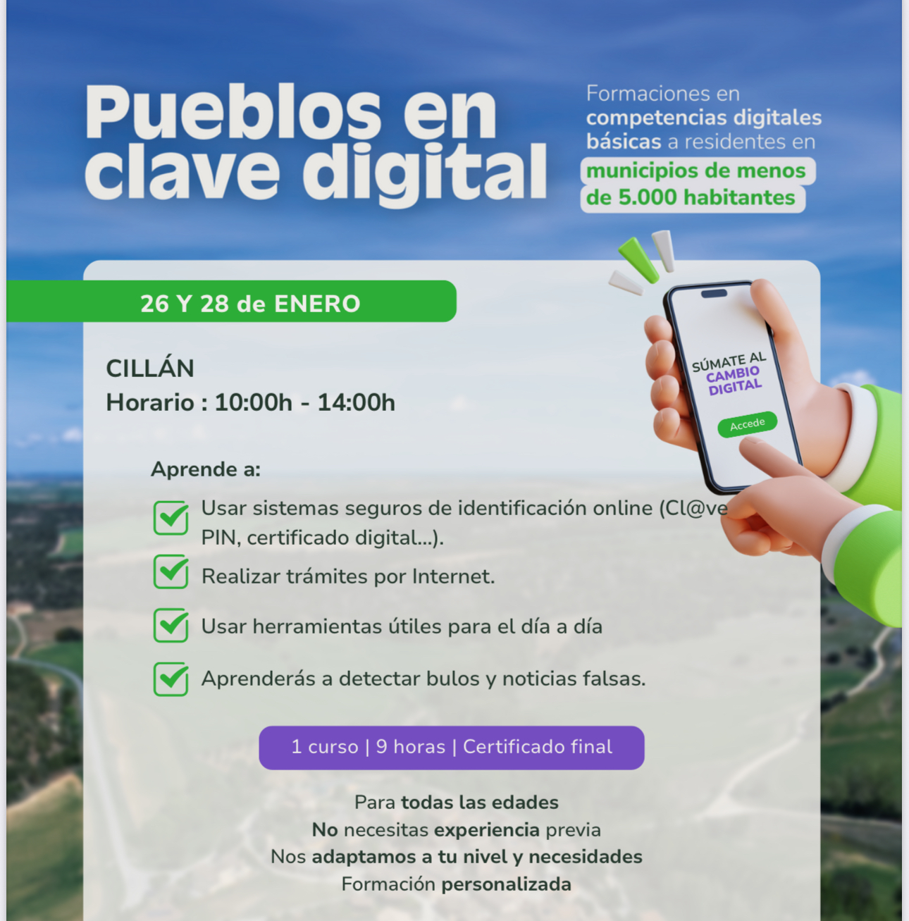 Se comunica que los talleres de "Pueblos en clave digital" tendrán finalmente horario de tarde: de 16:00 a 20:00 h los días 26 y 27 de Enero de 2026.