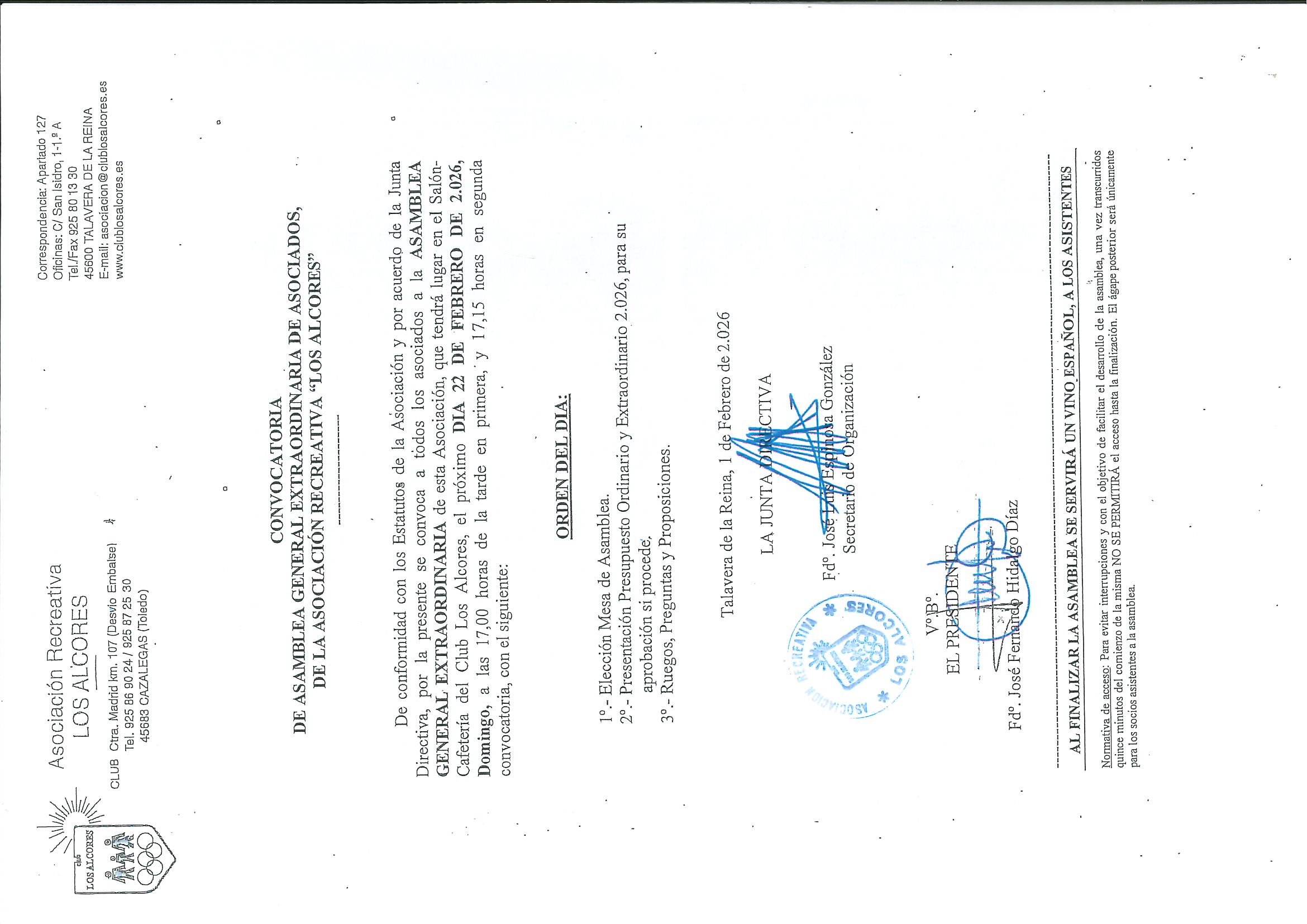 Les recordamos que este domingo, 22 de febrero, se convoca a todos los asociados a la ASAMBLEA GENERAL EXTRAORDINARIA de esta Asociación, que tendrá lugar en el Salón de la Cafetería Restaurante del Club Los Alcores, a las 17:00 horas en primera y a las 17:15 h en segunda convocatoria.