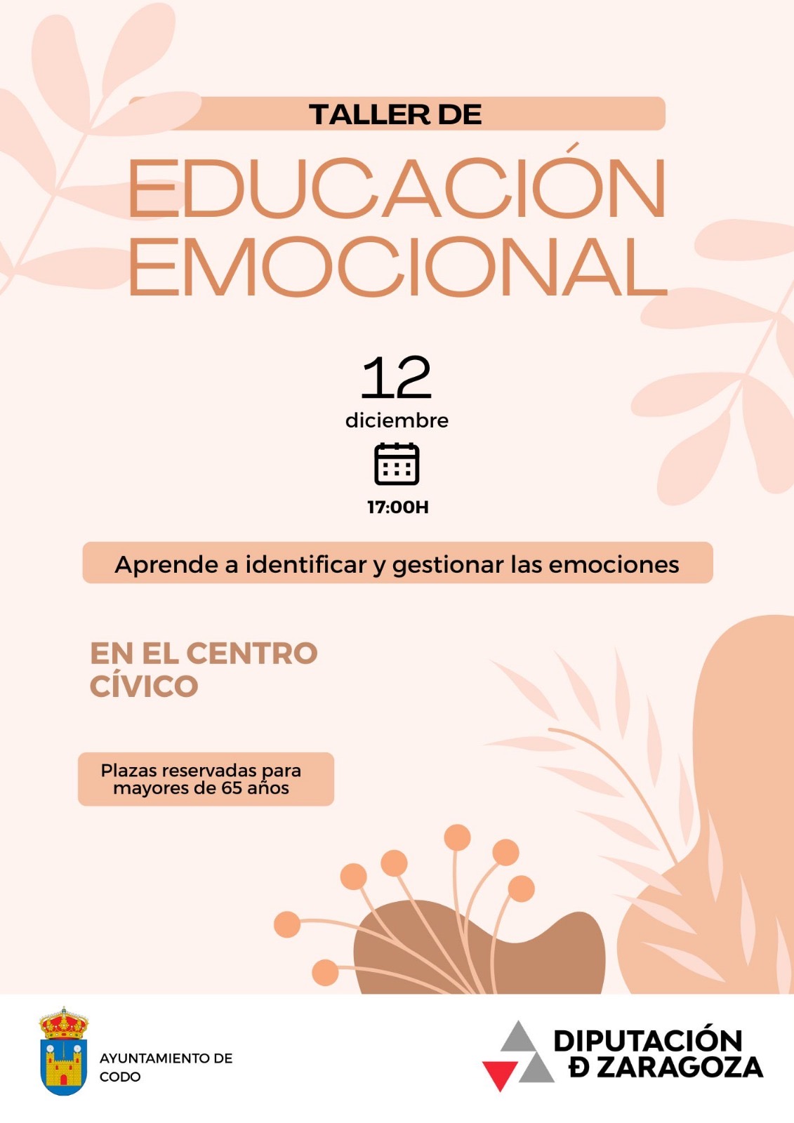 El Ayuntamiento de Codo informa de que el próximo 12 de diciembre a las 17:00 h se celebrará en el Centro Cívico un Taller de Educación Emocional, dirigido a personas mayores de 65 años.