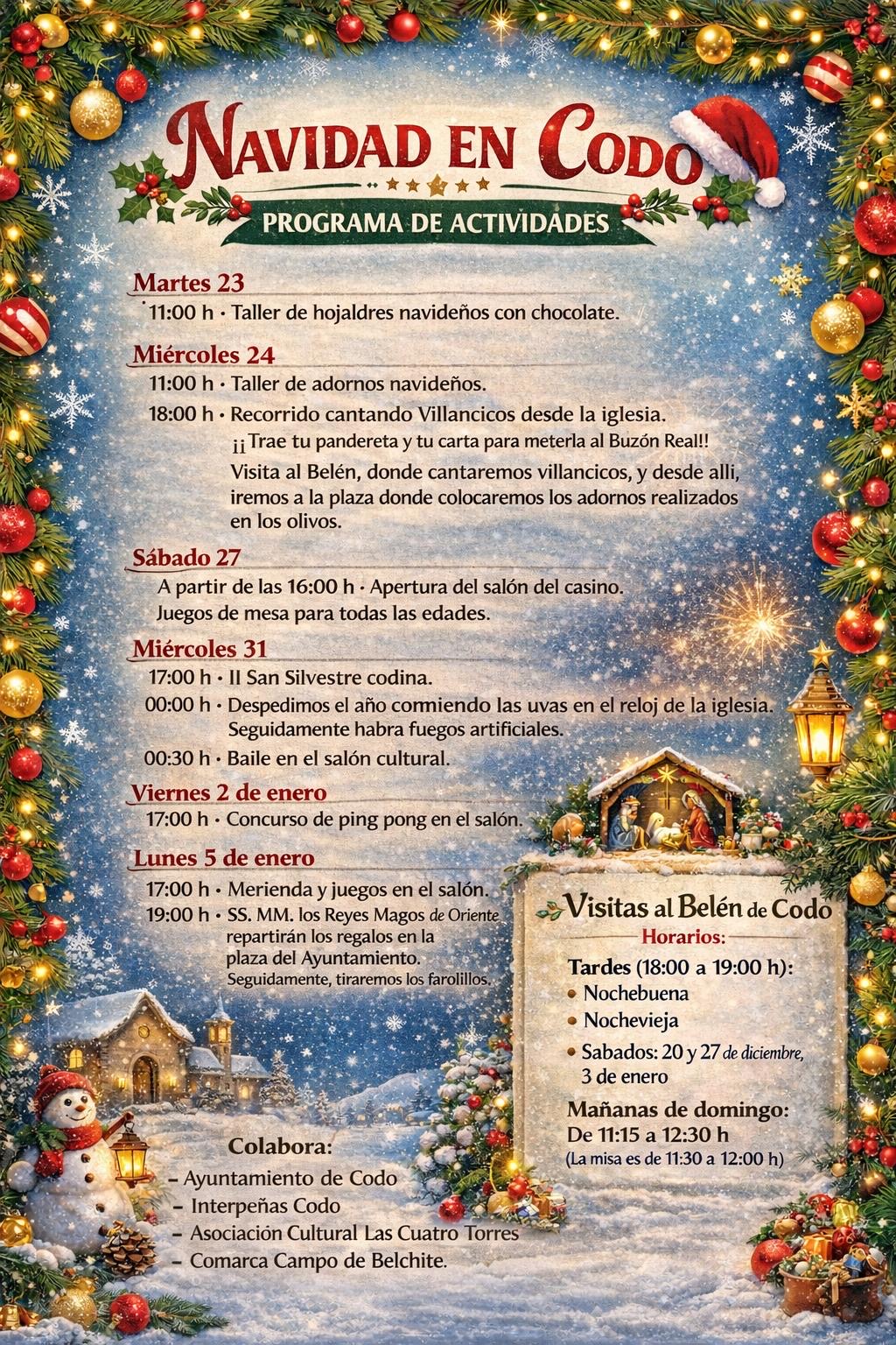 🎄✨ Navidad en Codo ✨🎄 Estas fiestas, Codo se llena de ilusión con un completo programa de actividades para todas las edades: talleres, villancicos, juegos, San Silvestre, Nochevieja, concursos y la esperada visita de los Reyes Magos. No te pierdas el Belén y vive la magia de la Navidad en nuestro pueblo. 🎶🎁🎆