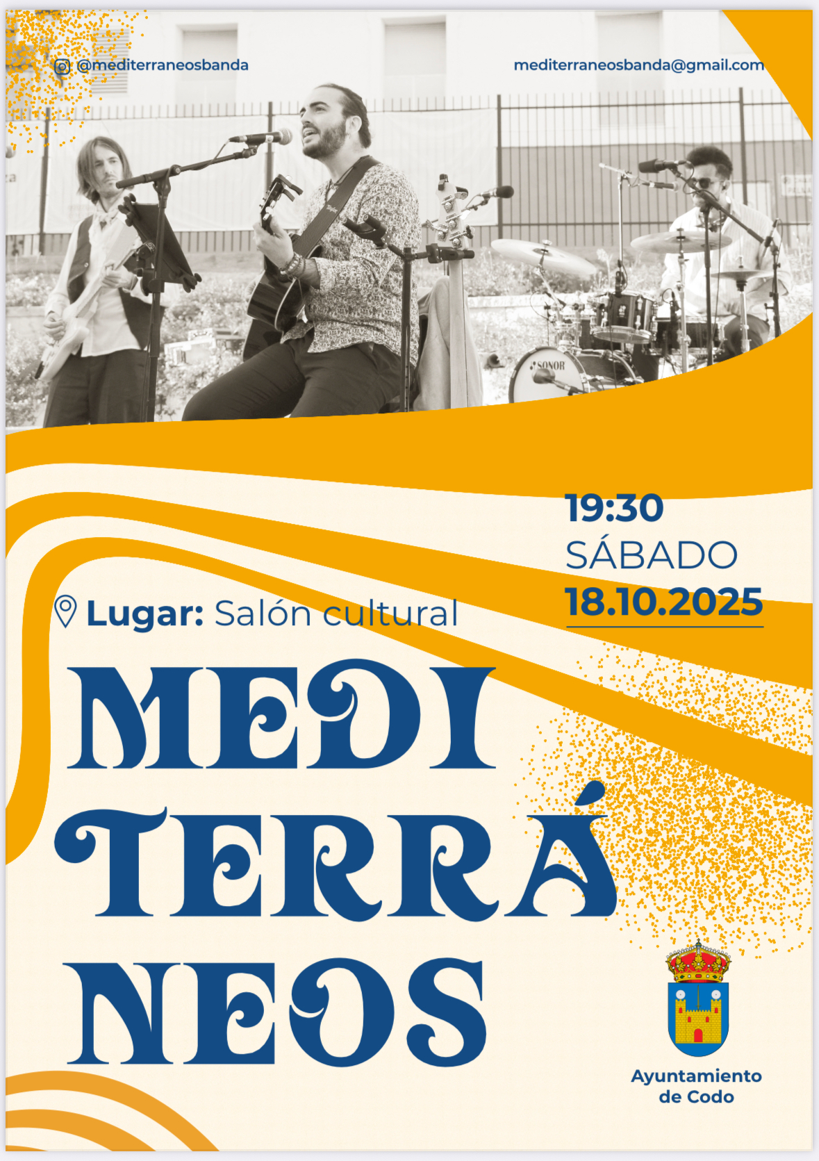 A las 19:30 h en el Salón Cultural de Codo, disfruta del concierto de Mediterráneos, una banda con sonido fresco, ritmo y mucho rollo mediterráneo 🌊💃