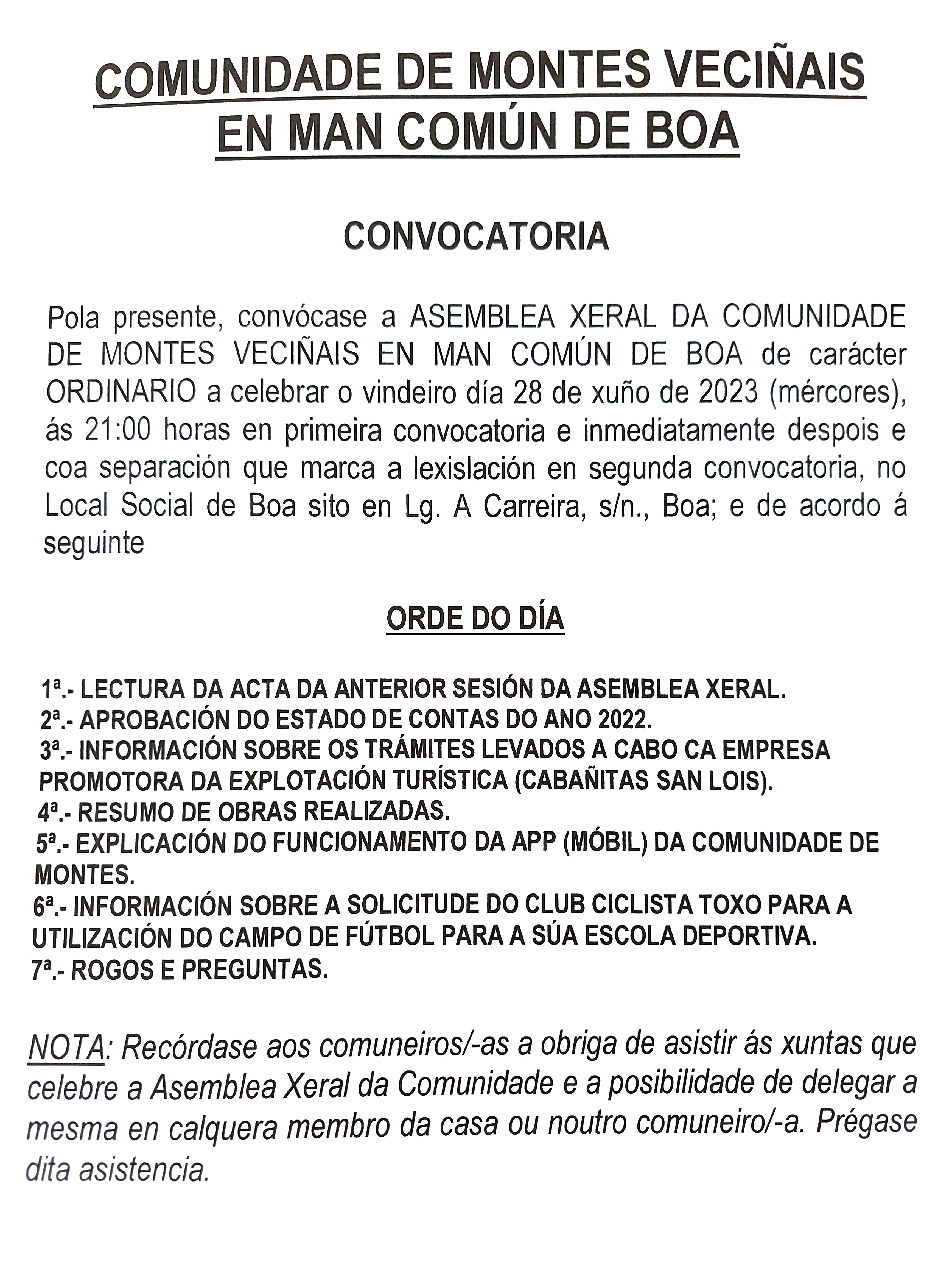 ola presente, convócase a ASEMBLEA XERAL DA COMUNIDADE DE MONTES VECIÑAIS EN MAN COMÚN DE BOA de carácter ORDINARIO a celebrar o vindeiro día 18 de xuño de 2025 (mércores), ás 20:30 horas en primeira convocatoria e inmediatamente despois e coa separación que marca a lexislación en segunda convocatoria, no Local Social de Boa sito en A Carreira, s/n., Boa; e de acordo á seguinte