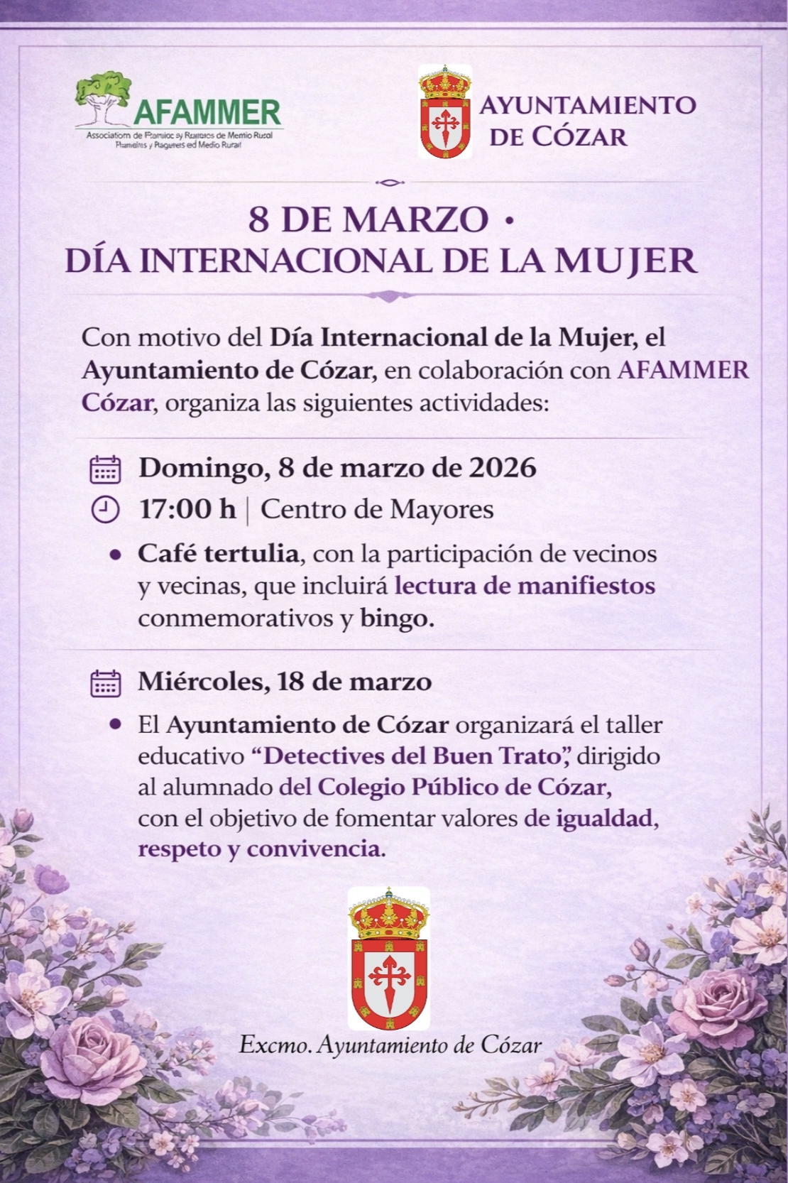 ✅ Con motivo de la conmemoración del Día Internacional de la Mujer, el Ayuntamiento de Cózar junto con AFAMMER Cózar, organiza las siguientes actividades: