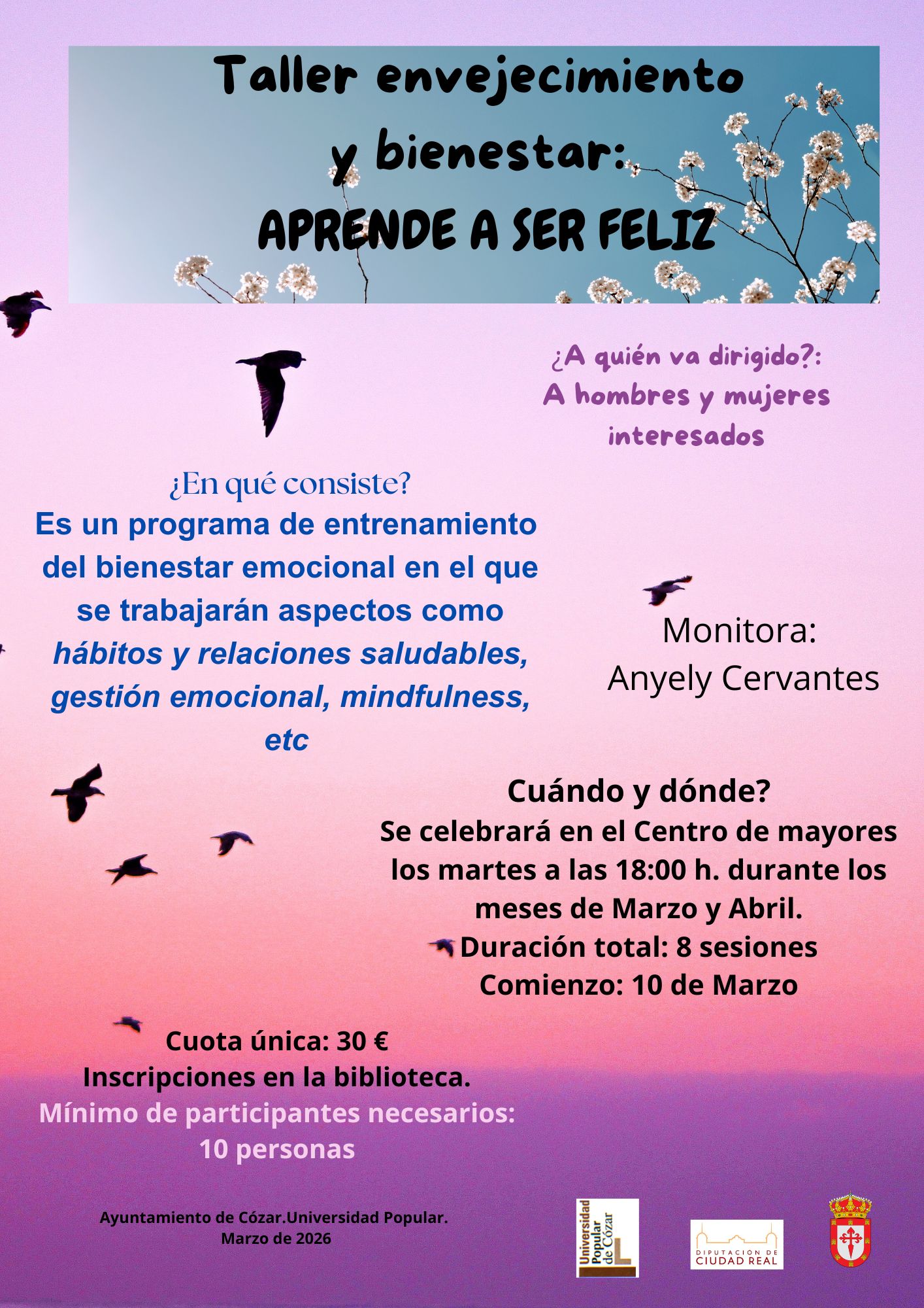 Desde el Ayuntamiento de Cózar y la Universidad Popular ponemos en marcha este taller orientado a mejorar el bienestar emocional y la calidad de vida