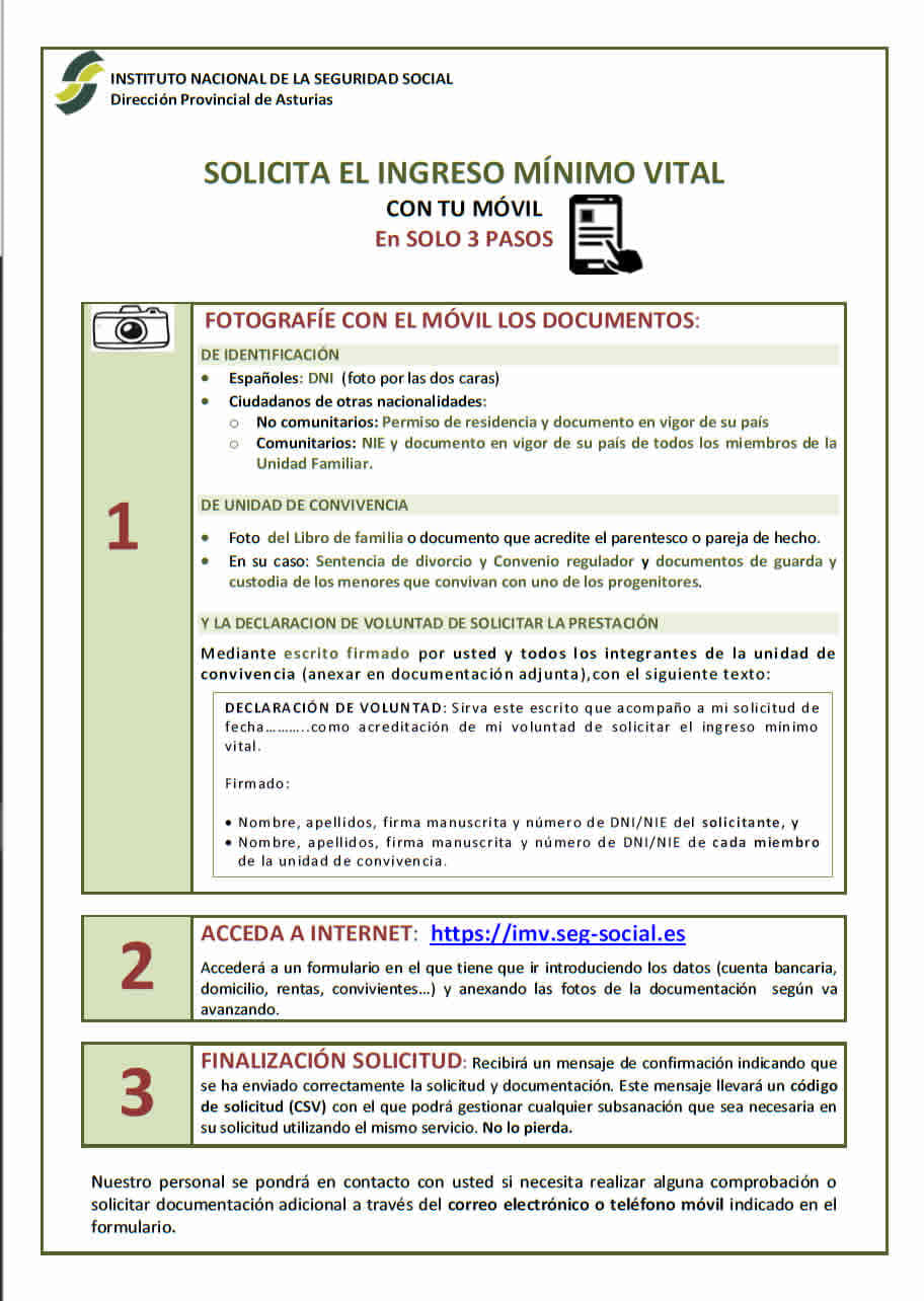 INGRESO MÍNIMO VITAL2021-02-17 09:51:58Info GeneralDesde la Dirección provincial de Asturias del Instituto Nacional de la Seguridad Social nos piden que compartamos una infografía en la que se explica cómo poder solicitar fácilmente desde el teléfono móvil el #IngresoMínimoVital.