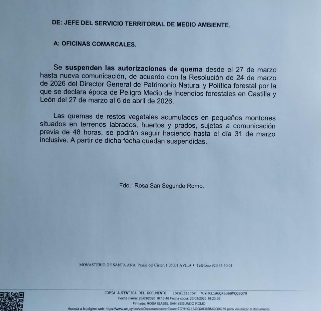 ⛔️Quedan suspendidas las autorizaciones de quema en monte.