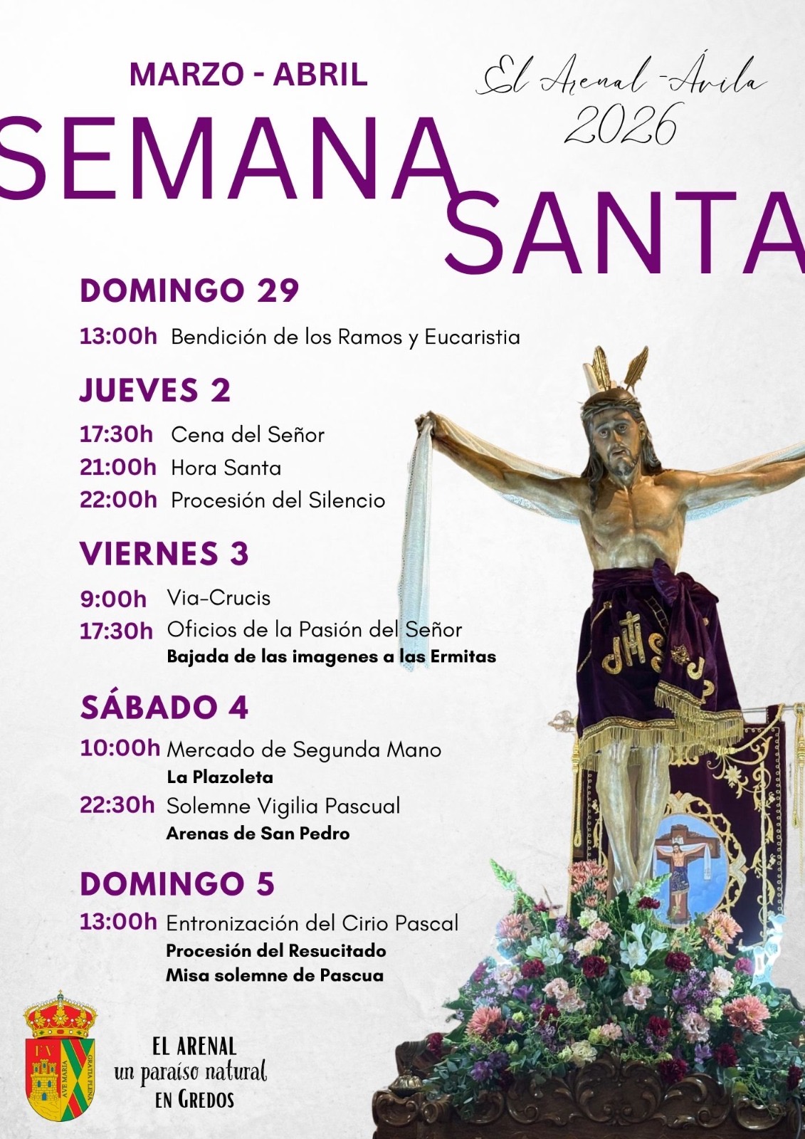 El Ayuntamiento de El Arenal informa de la programación prevista con motivo de la celebración de la Semana Santa 2026.