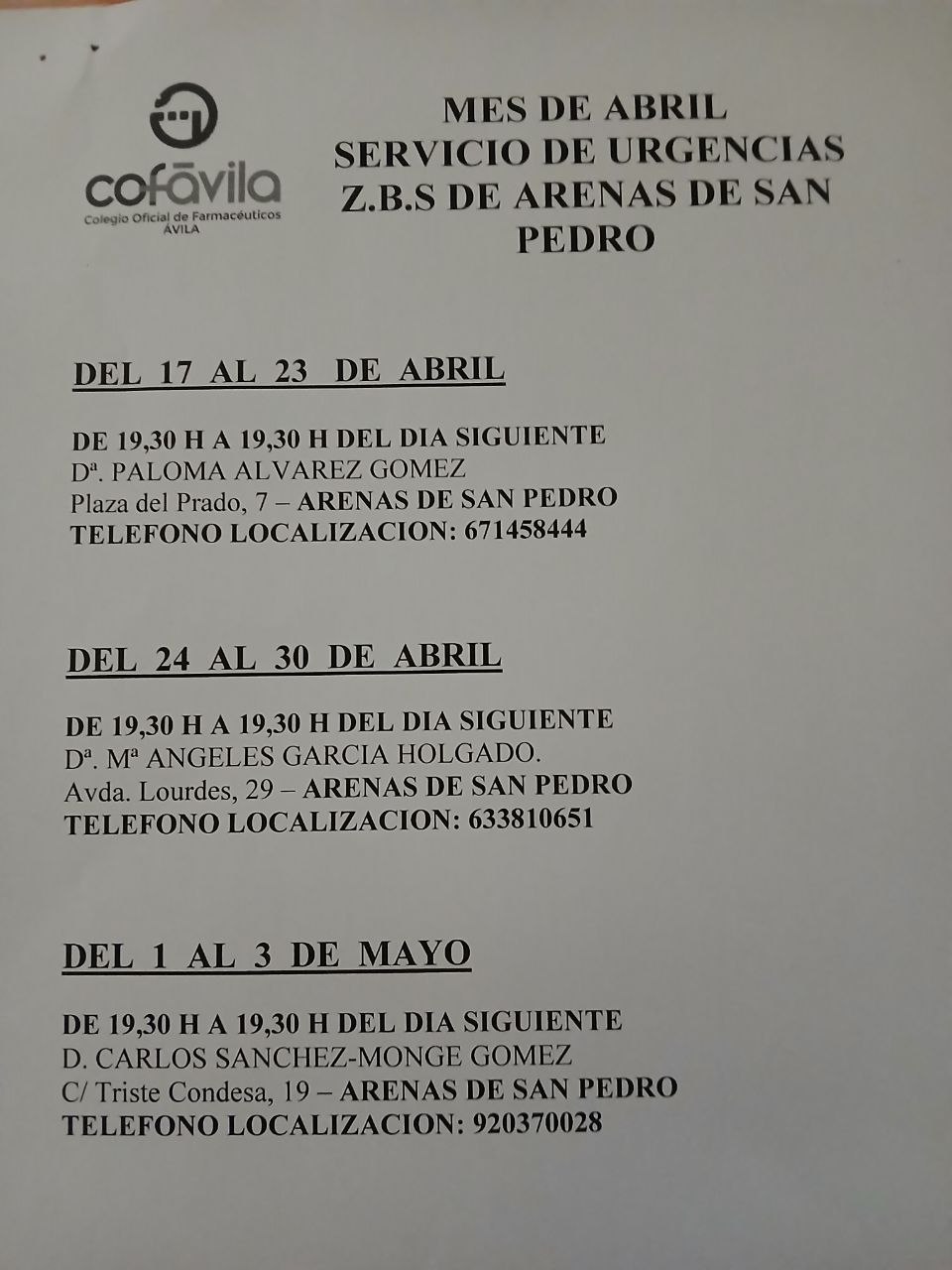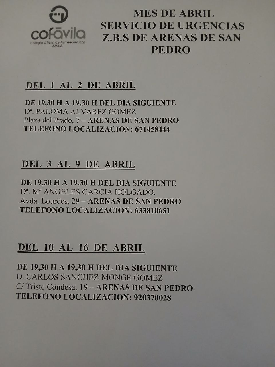 El Ayuntamiento de El Arenal informa del calendario del servicio de urgencias farmacéuticas correspondiente al mes de abril en la Zona Básica de Salud de Arenas de San Pedro.