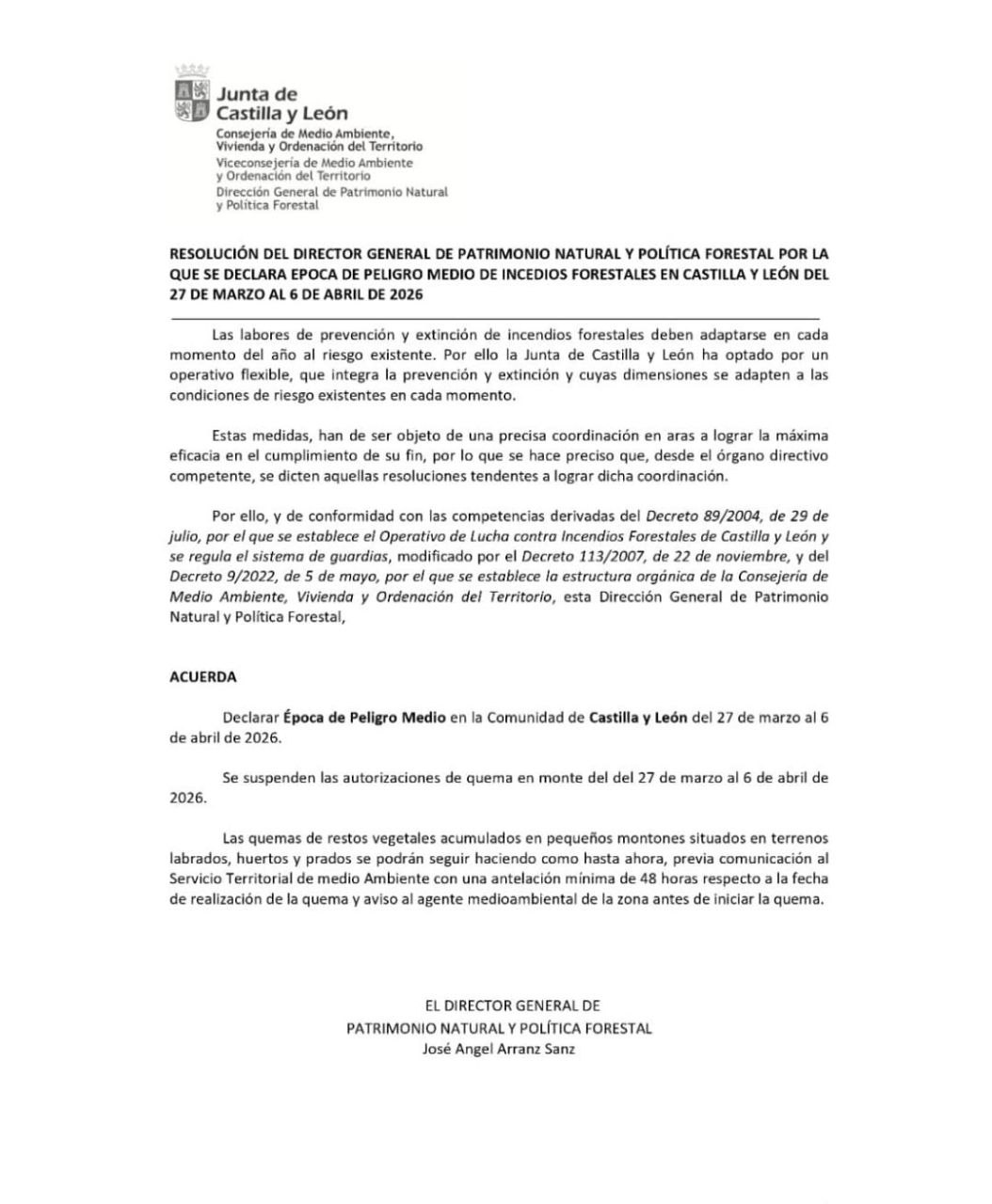 ℹ️El Ayuntamiento de El Arenal informa que la Junta de Castilla y León ha declarado Época de Peligro Medio de Incendios Forestales en toda la Comunidad, del 27 de marzo al 6 de abril de 2026.