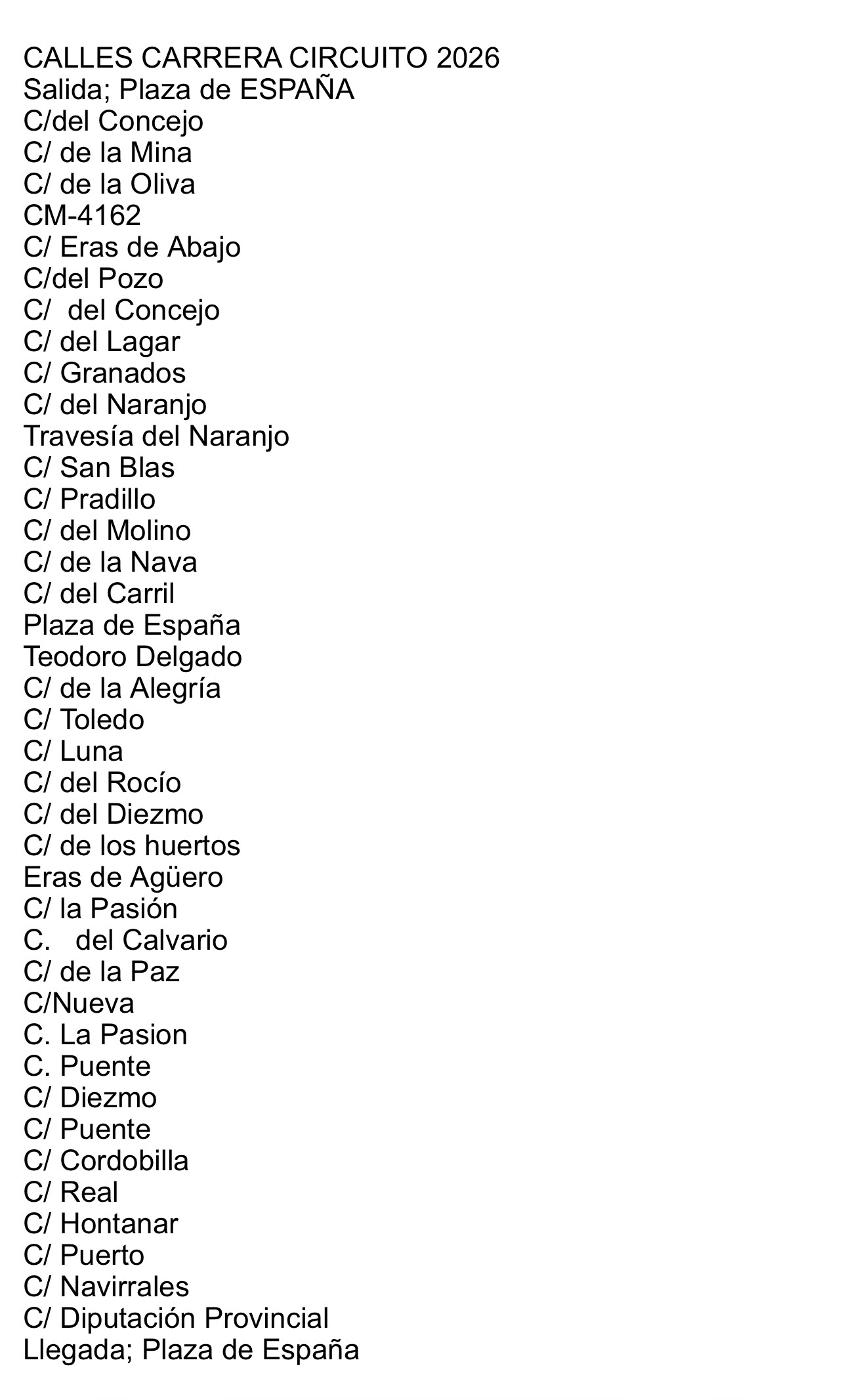A petición de la Asociación Cultural Campillana se adjunta imagen con el listado de calles rectificado del recorrido de la IV Carrera Popular La Jara para el jueves día 2 de abril de 2026.
