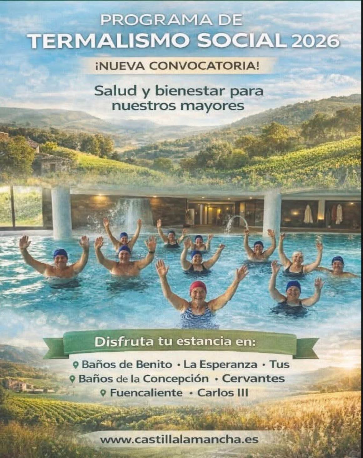 La Junta de Comunidades de Castilla-La Mancha, a través de la Consejería de Bienestar Social, impulsa una nueva convocatoria del Programa de Termalismo Social, una iniciativa que fomenta la salud, el bienestar y el envejecimiento activo de las personas mayores de nuestra región.