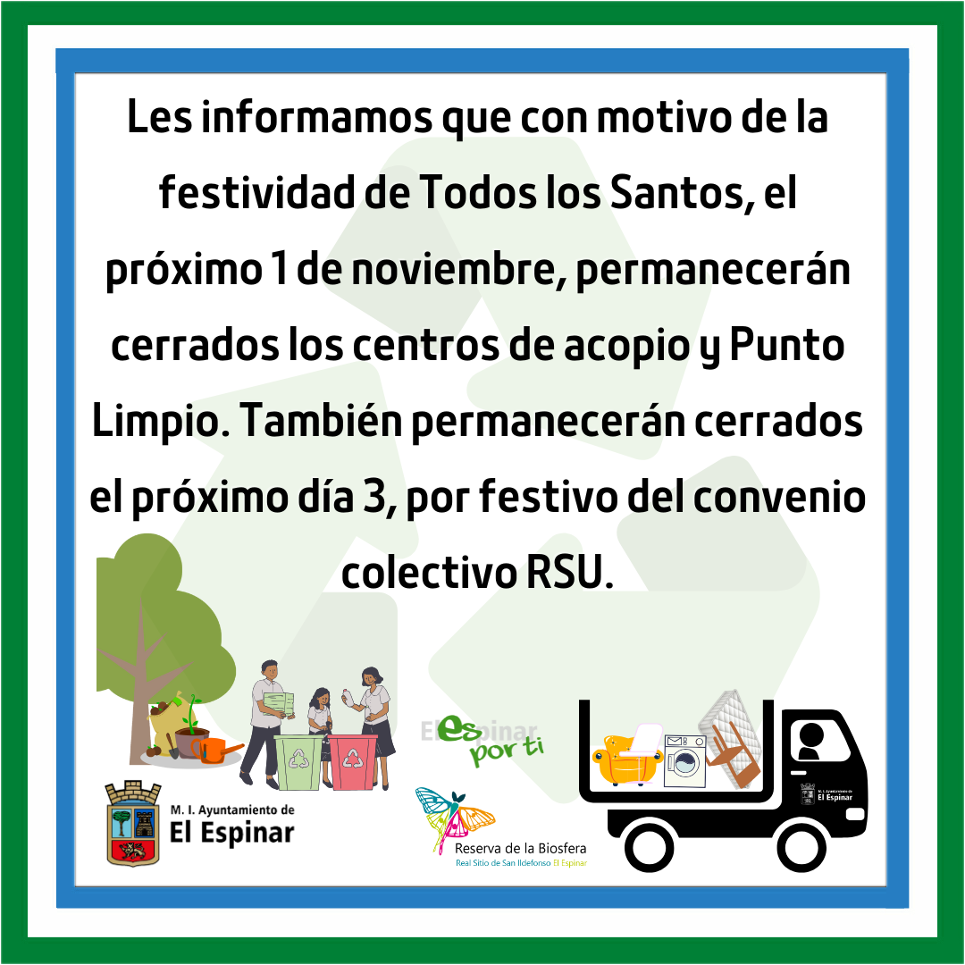 Centros de aportación de restos vegetales y el Punto Limpio municipal permanecerán cerrados al público los días 1 y 3 de noviembre.2025-10-29 09:51:46Medio AmbienteEl Ayuntamiento de El Espinar informa que los centros de aportación de restos vegetales y el Punto Limpio municipal permanecerán cerrados al público los días 1 y 3 de noviembre.