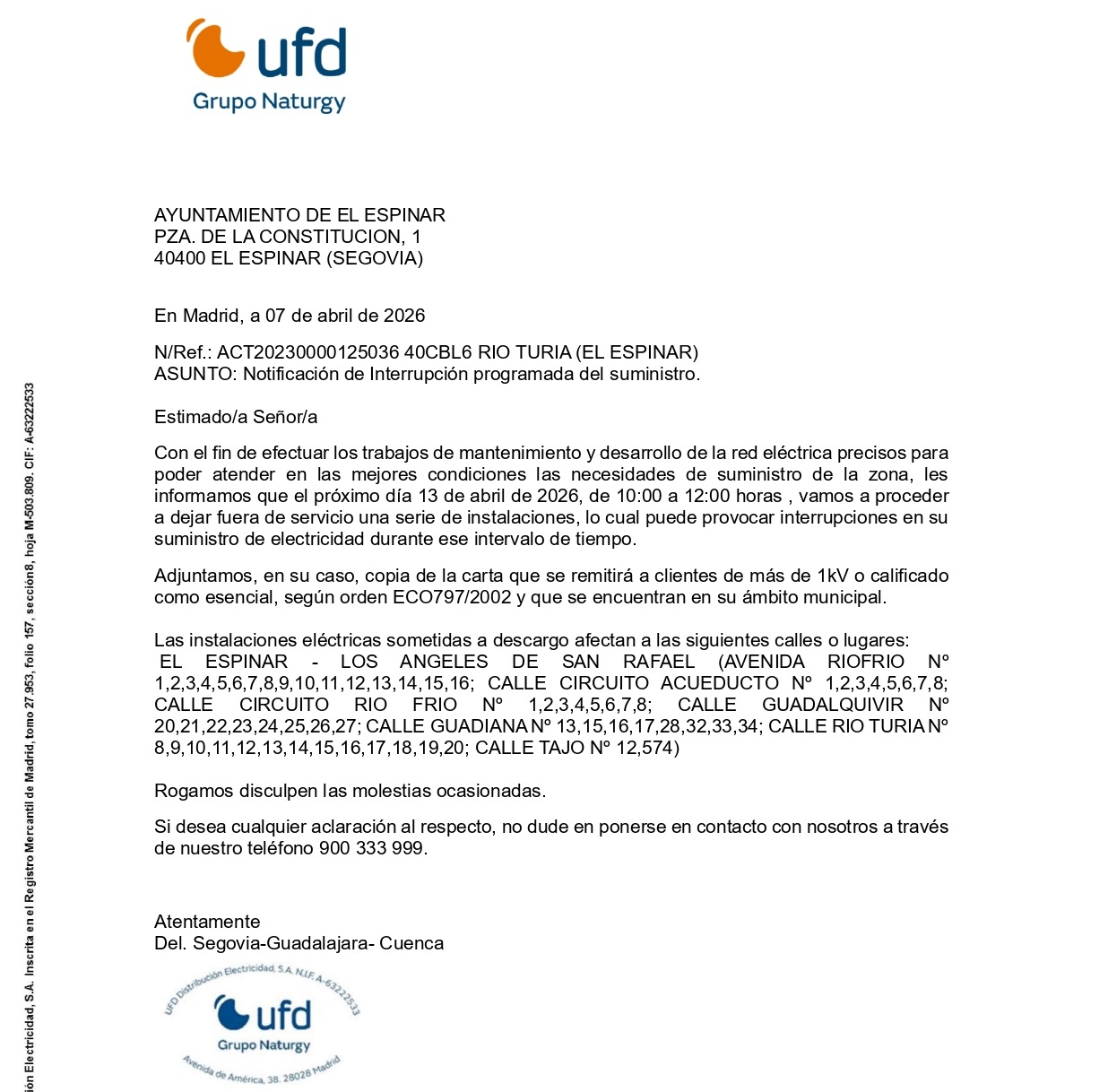 La empresa distribuidora UFD comunica una nueva interrupción del suministro eléctrico el próximo lunes 13 de abril de 2026 para efectuar mejoras en la red de distribución.