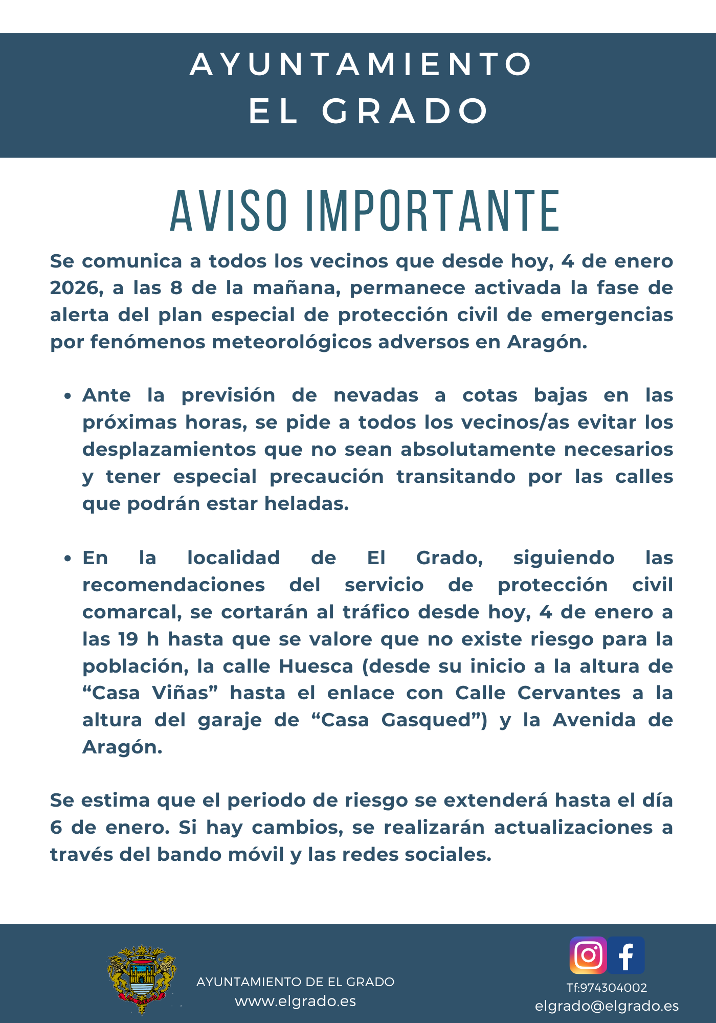 Se comunica a todos los vecinos que desde hoy, 4 de enero 2026, a las 8 de la mañana, permanece activada la fase de alerta del plan especial de protección civil de emergencias por fenómenos meteorológicos adversos en Aragón.