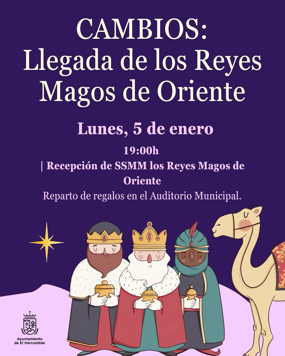 Desde el Ayuntamiento de El Herrumblar informamos que, debido a las condiciones meteorológicas, se han realizado modificaciones en el programa previsto para la llegada de Sus Majestades los Reyes Magos de Oriente, con el fin de garantizar la seguridad y el disfrute de todos.