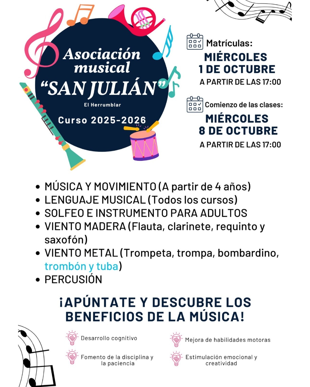 Desde el Ayuntamiento de El Herrumblar compartimos la información de la Asociación Musical San Julián para el nuevo curso 2025/2026.