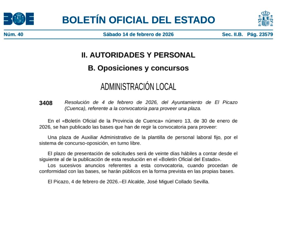 De acuerdo con la Base 3.1 de la Convocatoria pública para la selección de una plaza de auxiliar administrativo mediante el sistema de concurso-oposición en El Picazo publicadas en el Boletín Oficial de la Provincia nº 13 de 30 de Enero de 2026, el plazo de admisión de instancias solicitando tomar parte en las pruebas selectivas será de veinte días hábiles contados a partir del siguiente al de la publicación del extracto de la convocatoria en el Boletín Oficial del Estado.