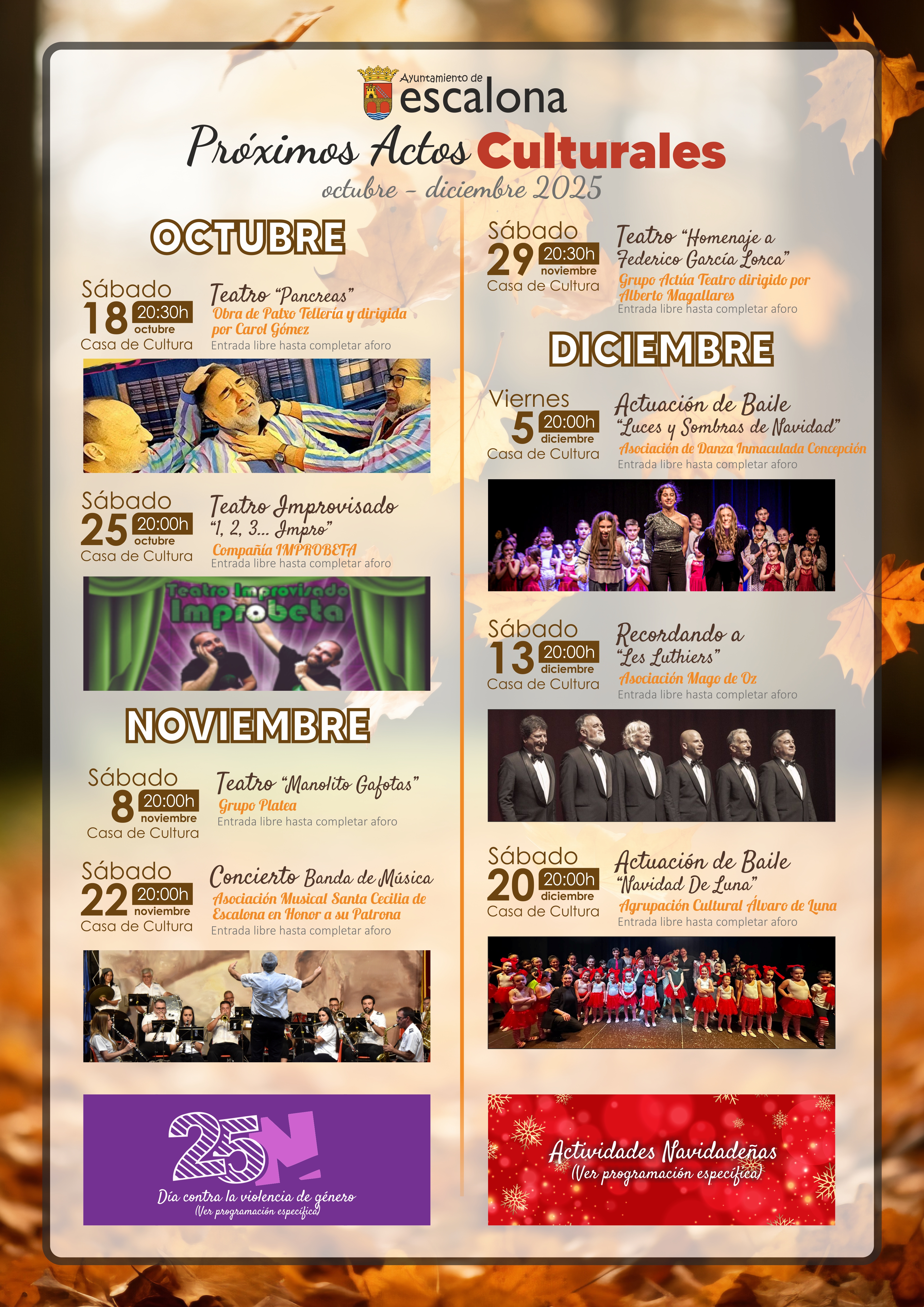 🎭 Próximos Actos Culturales en Escalona | Octubre - Diciembre 20252025-10-15 20:10:03CulturaEl Ayuntamiento presenta la programación cultural para los meses de octubre, noviembre y diciembre de 2025, con una variada agenda de teatro, música y danza en la Casa de Cultura.