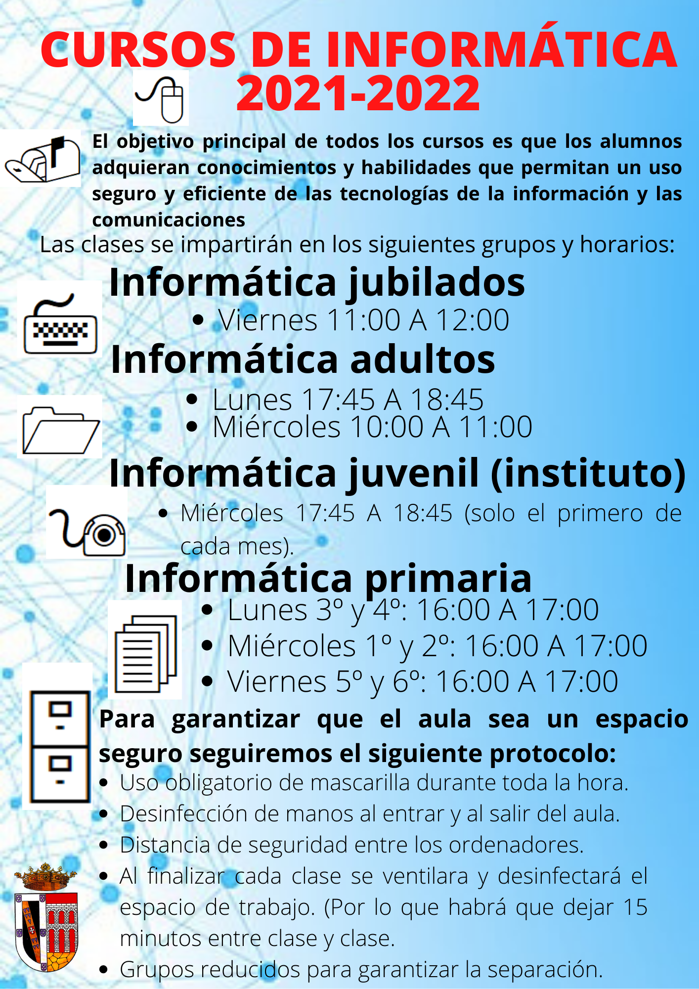 Buenas tardes hemos tenido que modificar el horario de las clases de informática a los alumnos de primaria, para que no se junte ninguna actividad, se adjunta el nuevo cartel