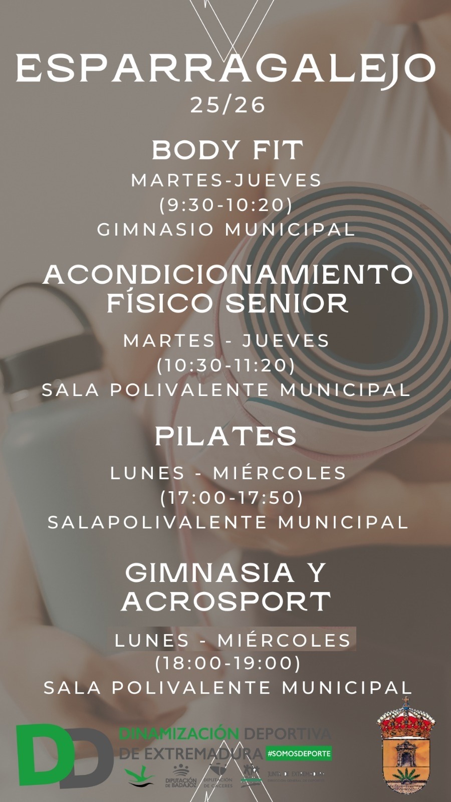 Se informa a todos los alumnos de las actividades deportivas que Mañana Jueves 15 de Enero 2026 comienzan las clases se Body Fit, Acondicionamiento Físico Senior, Acrosport y Pilates EN SUS HORARIOS HABITUALES.