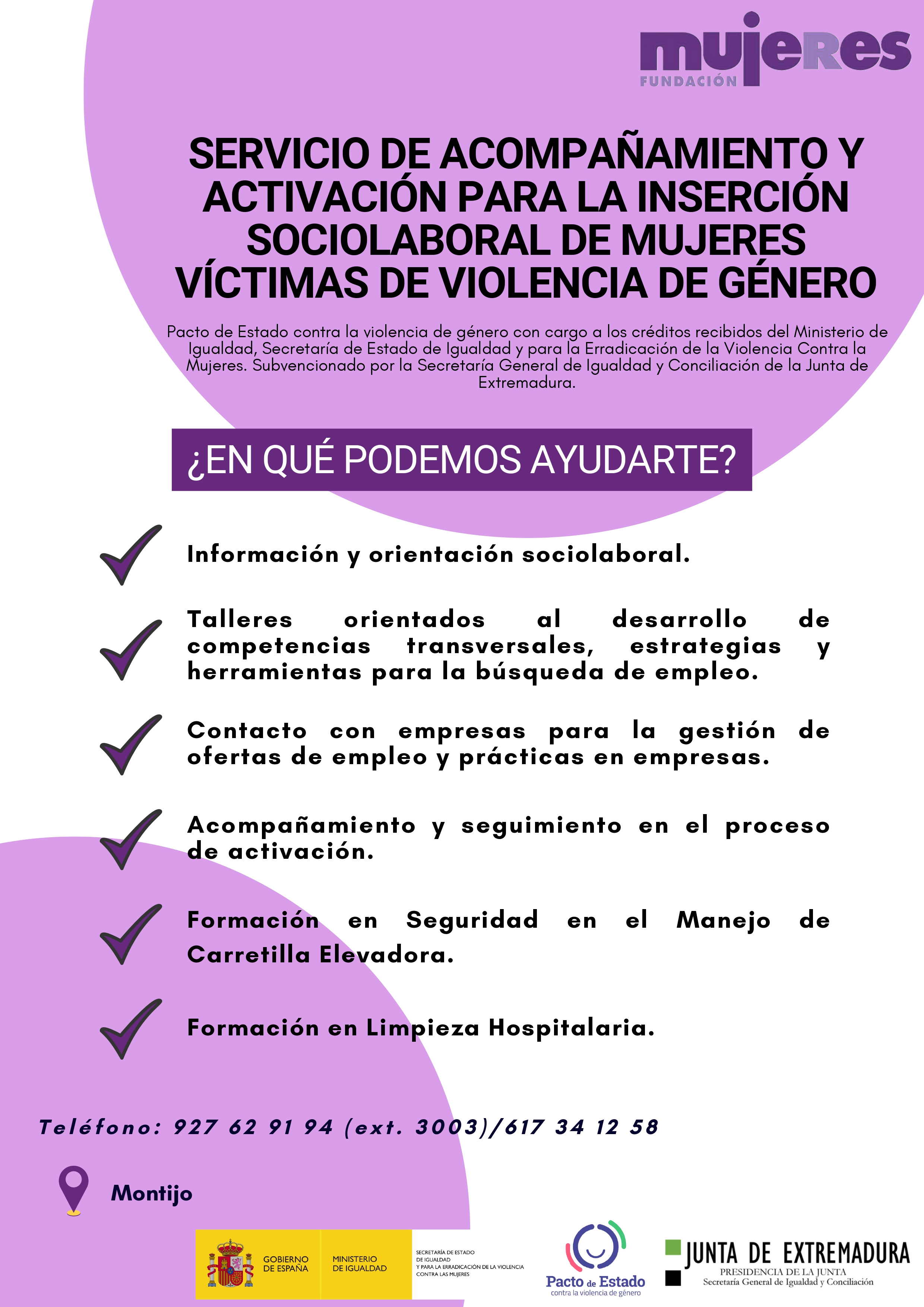 Desde la Fundación Mujeres de Cáceres se pone en marcha un nuevo punto de atención en Montijo para llevar a cabo el programa Servicio de acompañamiento y activación para la inserción sociolaboral de mujeres víctimas de violencia de género financiado por el Pacto de Estado.