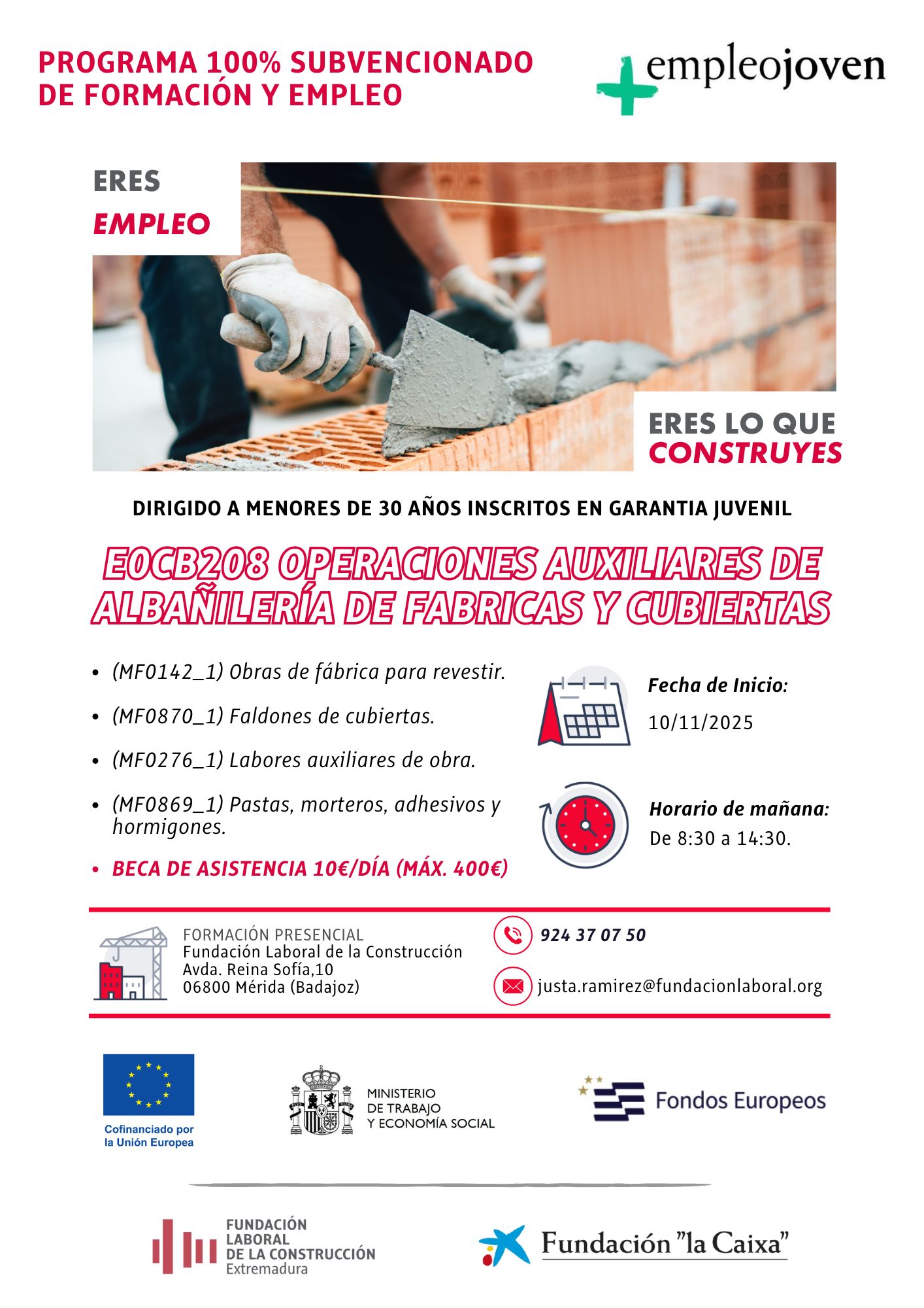 Desde la Fundación Laboral de la Construcción informan de una nueva Formación con Certificado de Profesionalidad de Nivel 1, EOCB0208. "Operaciones Auxiliares de Albañilería de fábricas y cubiertas", que se va a impartir en la Fundación Laboral de la Construcción de Mérida con el proyecto Más Empleo Joven de La Caixa.