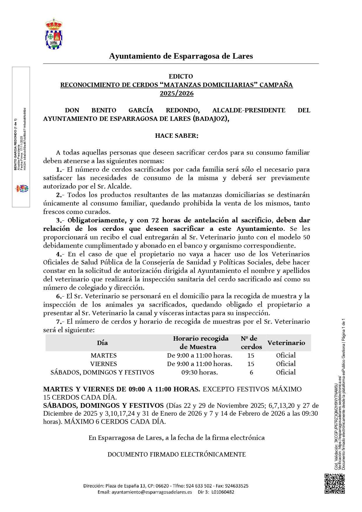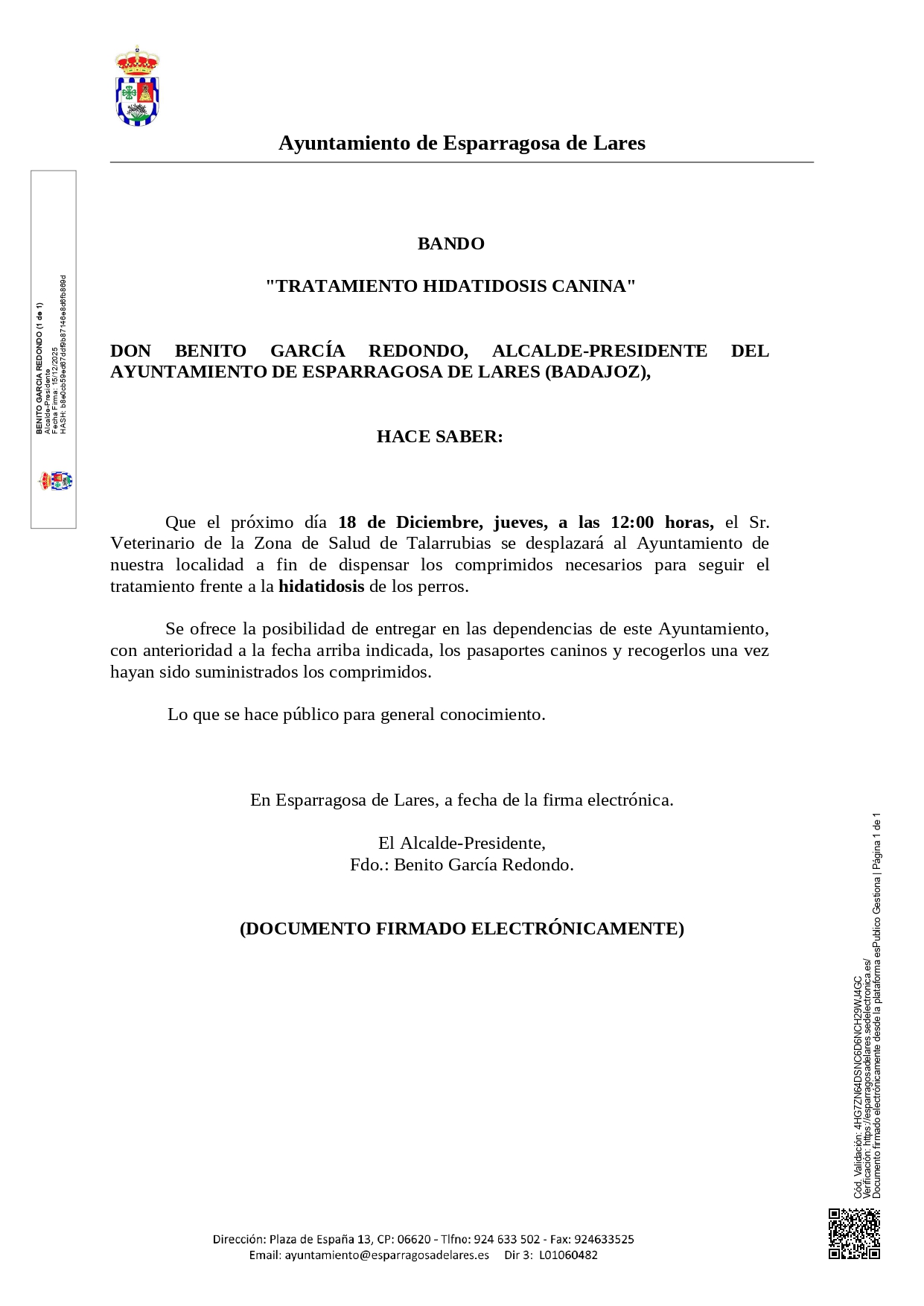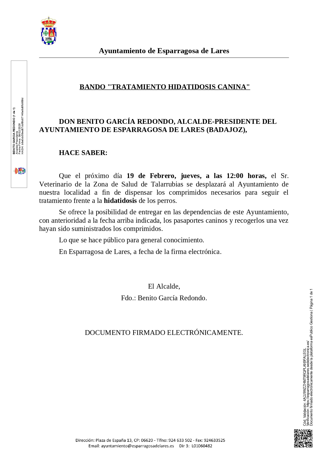 El próximo día 16 de Octubre, jueves, a las 12:00 horas, el Sr. Veterinario de la Zona de Salud de Talarrubias se desplazará al Ayuntamiento de nuestra localidad a fin de dispensar los comprimidos necesarios para seguir el tratamiento frente a la hidatidosis de los perros.