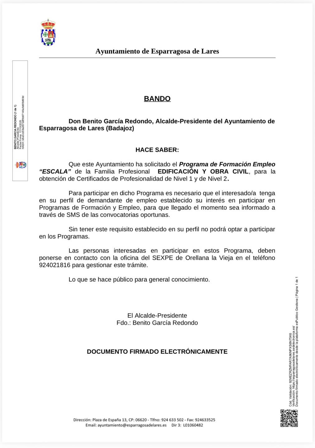 Que este Ayuntamiento ha solicitado el Programa de Formación Empleo “ESCALA” de la Familia Profesional EDIFICACIÓN Y OBRA CIVIL, para la