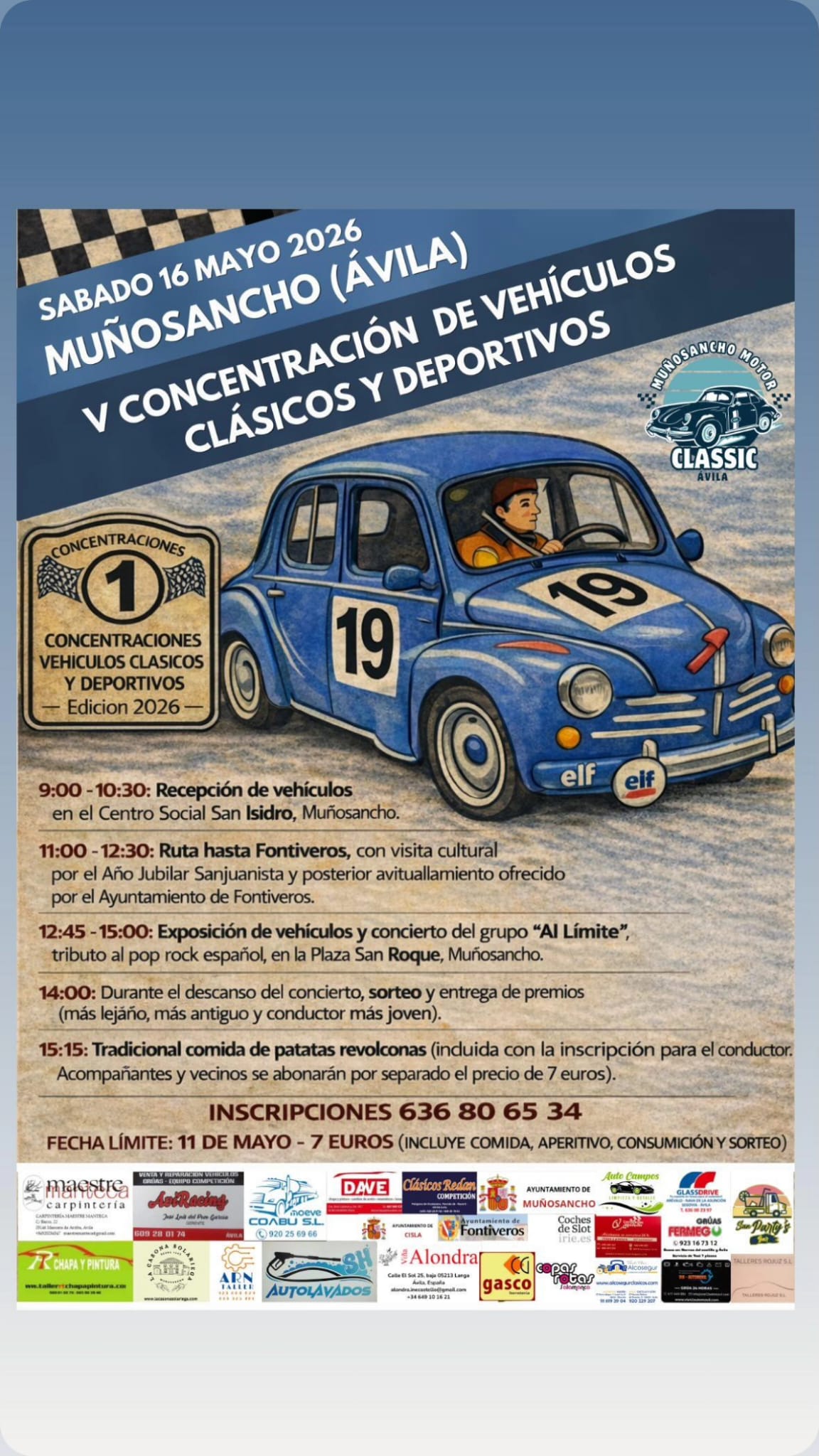 Nos informan de la V CONCENTRACION DE VEHÍCULOS CLÁSICOS Y DEPORTIVOS, que se va a realizar en Muñosancho y nos van a visitar en Fontiveros, el sábado 16 de mayo de 2026.