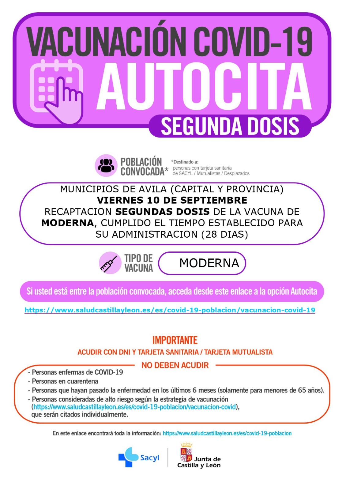 VACUNACION COVID-19 SEGUNDA DOSIS DE LA VACUNA MODERNA MEDIANTE AUTOCITA2021-09-02 10:33:09BANDOAutocita para la segunda dosis, el próximo día 10 de septiembre de 2021(viernes), recaptación de segundas dosis de: