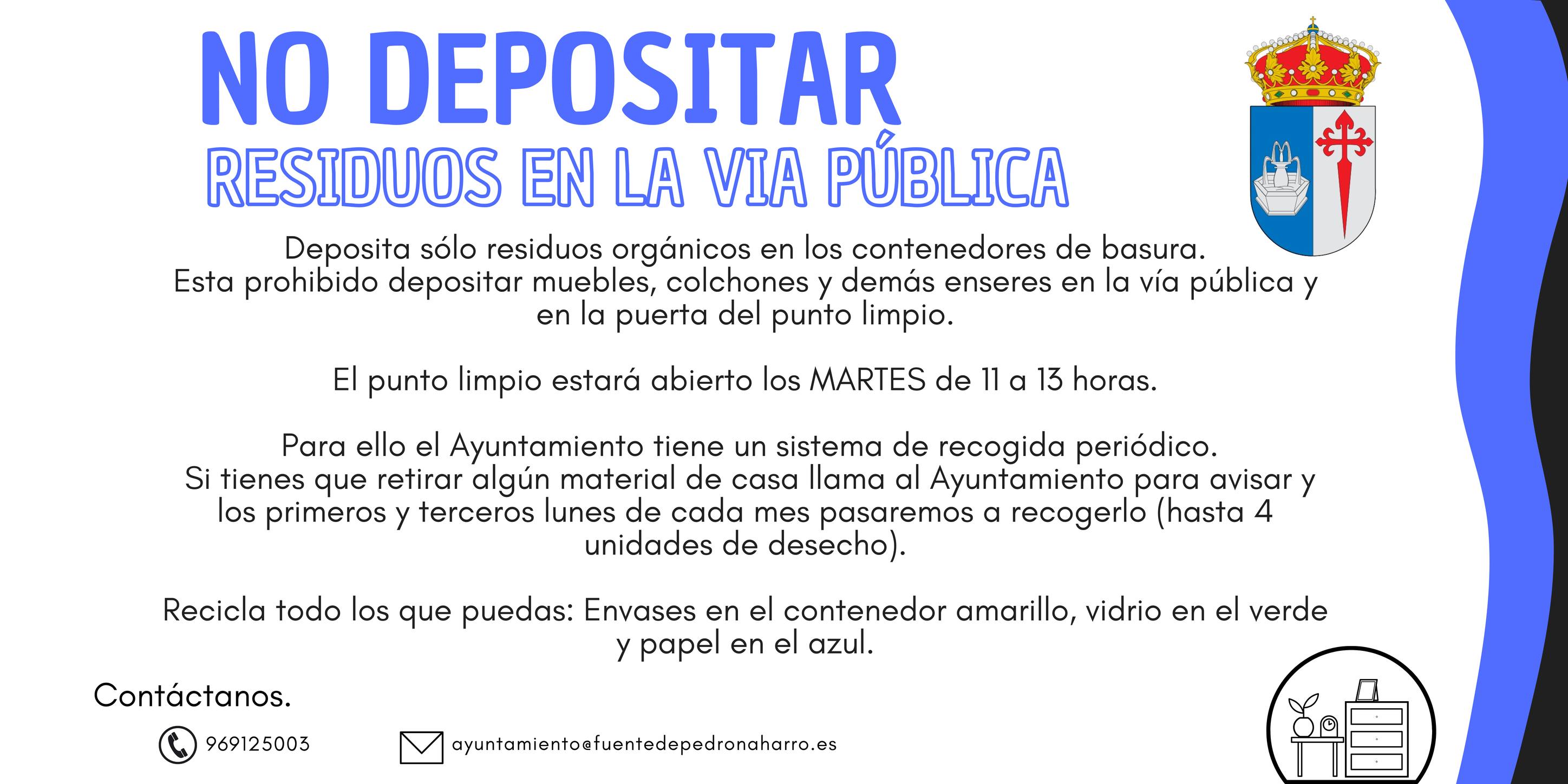 Os recordamos que esta prohibido depositar muebles, colchones y demás enseres tanto en la vía pública como en la puerta del punto limpio.
