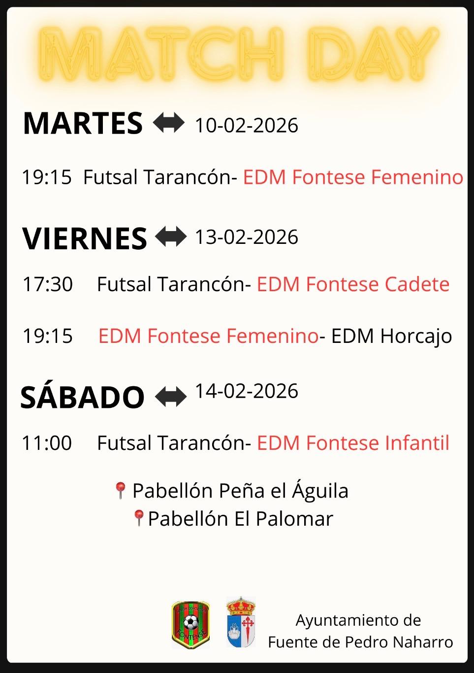 17:30 horas - Futsal Tarancón - EDM Fontense Cadete, en el Pabellón Peña el Águila (Tarancón).