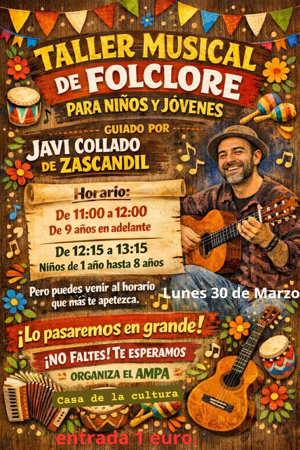 🎶 TALLER MUSICAL DE FOLKLORE- El próximo lunes 30 de marzo, en la Casa de la Cultura. Desde las 11 hasta las 13:15 horas (en dos turnos).