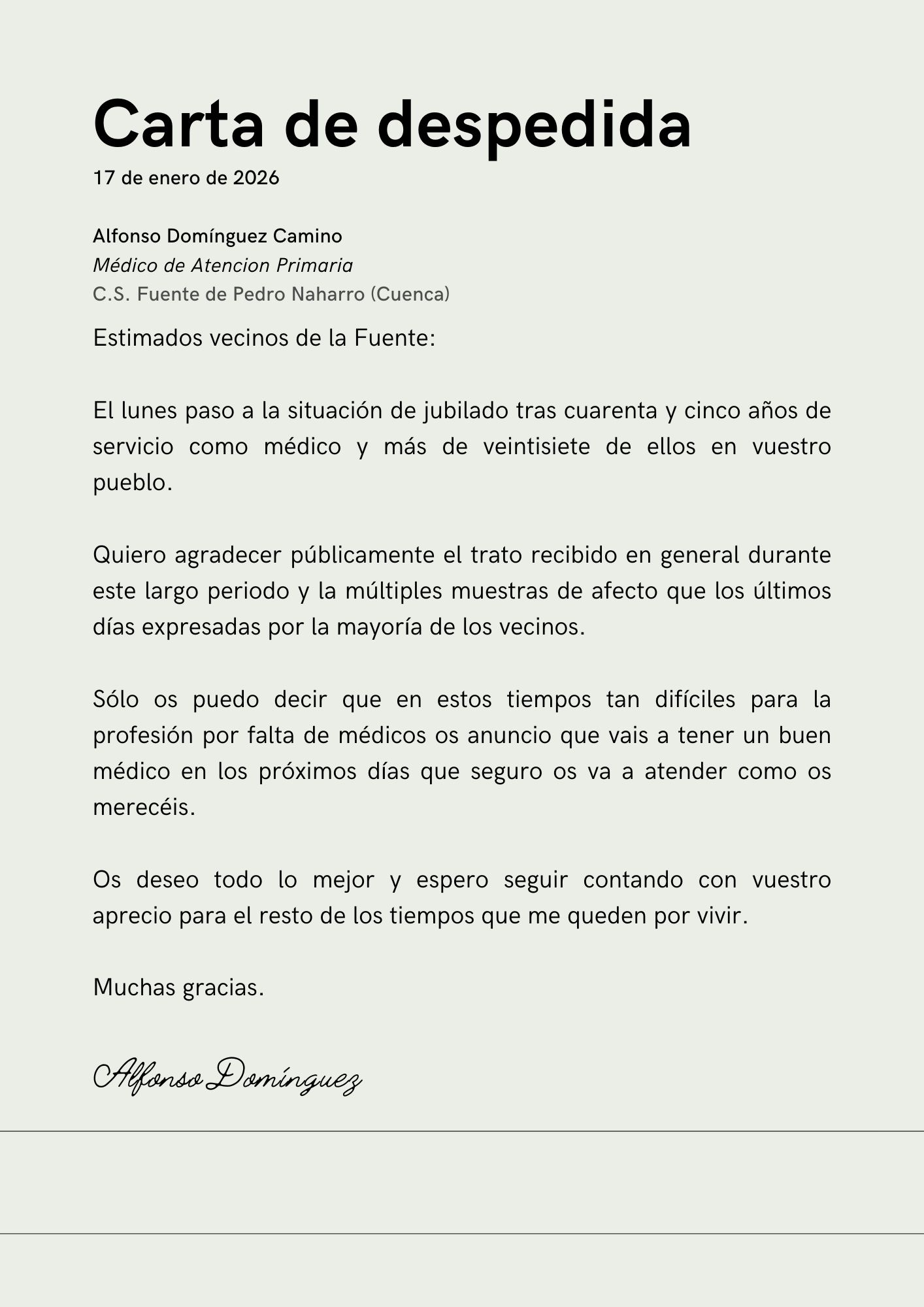 CARTA DE DESPEDIDA DE NUESTRO MÉDICO D. ALFONSO