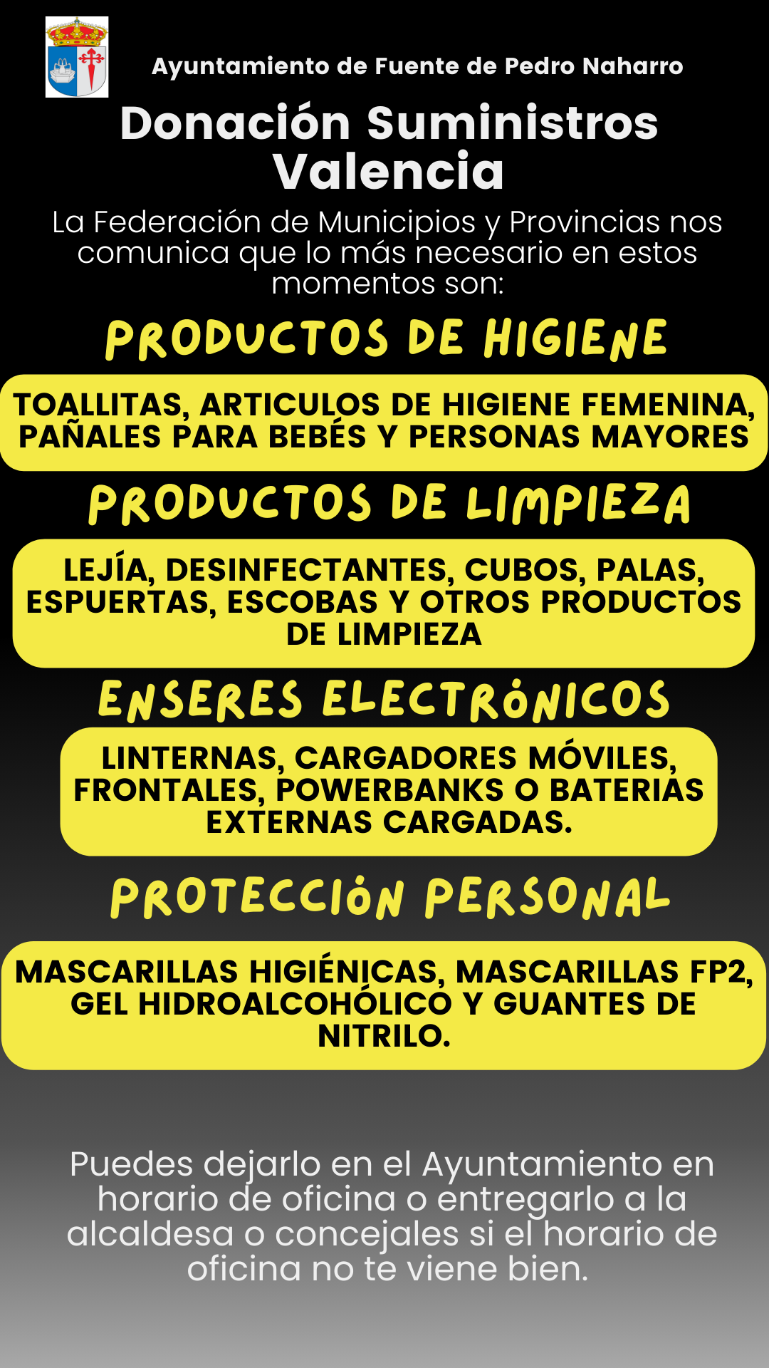 Desde la Federación Española de Municipios y Provincias, junto con la Federación Valenciana de Municipios y Provincias, nos agradecen todas las muestras de apoyo y donaciones que se están recibiendo y nos han dado instrucciones para proceder en la recogida y entrega de suministros para colaborar con los afectados de la Comunidad Valenciana por parte de los Ayuntamientos.